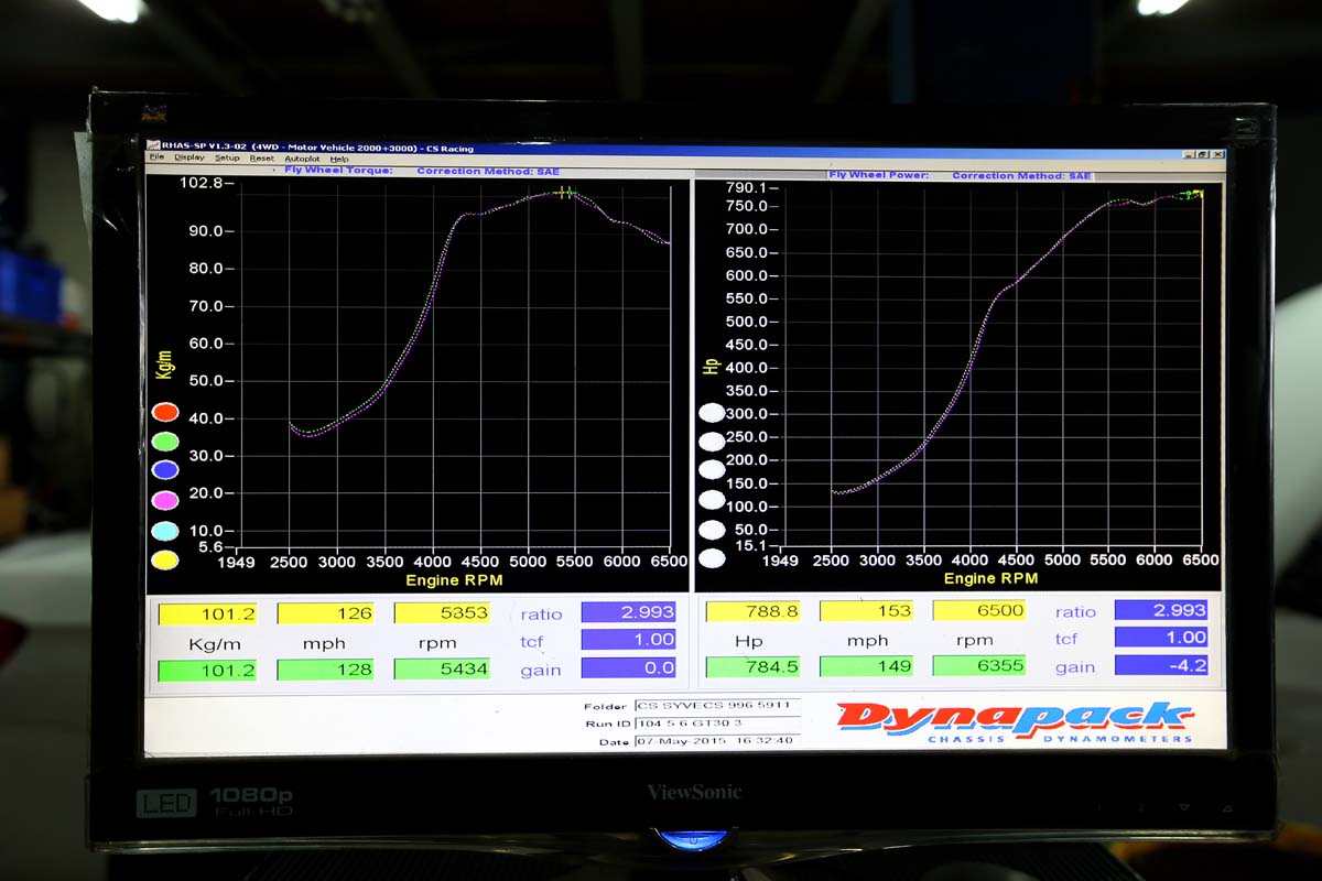 自從10個月前黑桃第一次接觸到996T後,就深深對這輛車感到著迷,原廠420hp/57.1kgm最大動力看似相當飽滿,不過根據黑桃表示這樣的動力其實並不優秀,且中低速的表現也較為空洞,並沒有達到相當好駕馭的境界,以Cs Racing改Stage1利用原廠渦輪修改,再搭配Syvecs及水噴射系統輔助下,最大增壓值1.65bar得到了優異的672.3hp/89.3kgm的最大輸出。