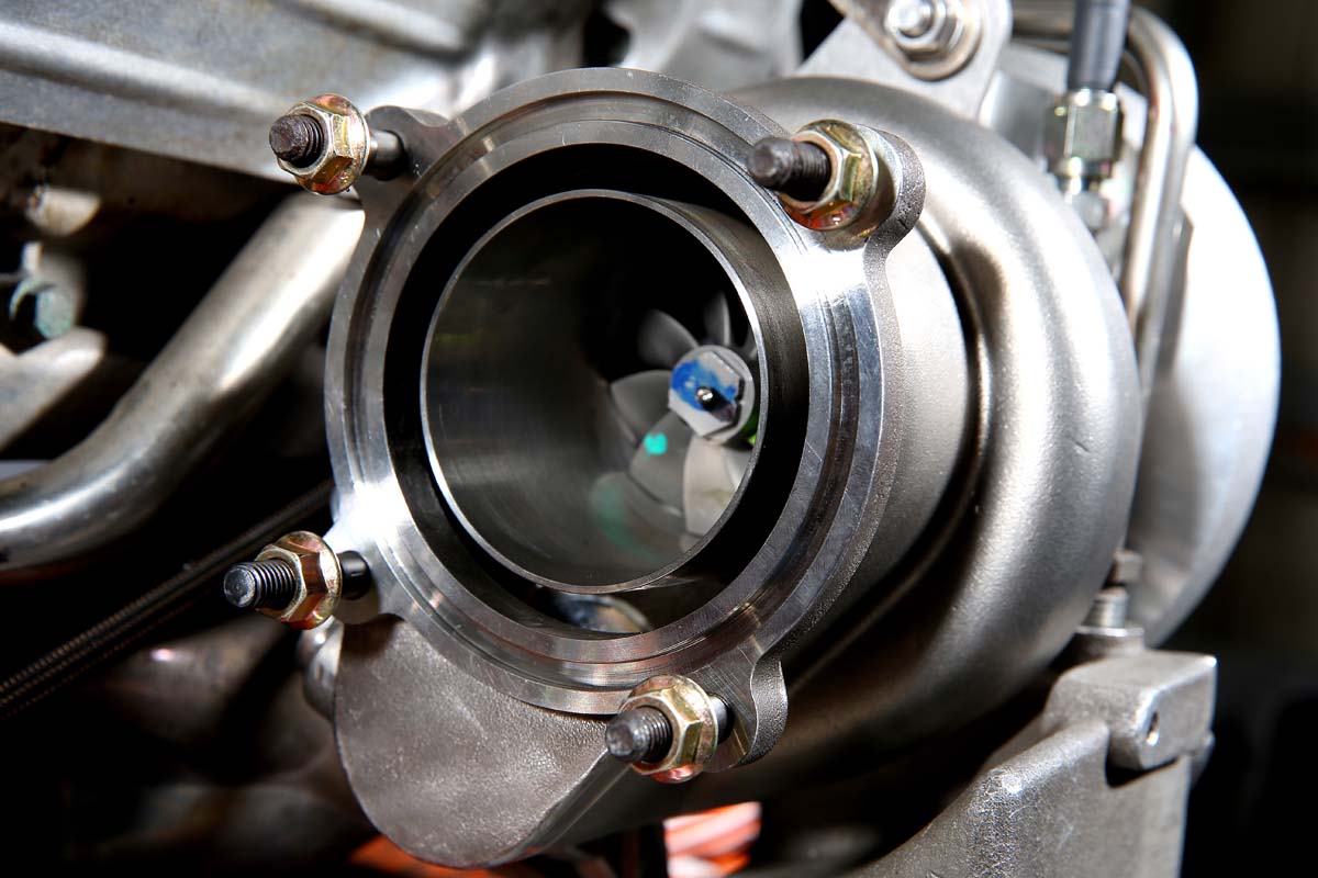 | 左方就是正3076的進氣端,圖片中可明顯看到Tail改則是為了空間問題縮小了進氣端大小,這也是最大增壓值僅能設定在2.0bar的關鍵,而葉片的部分Tail則是全數換上反應更好的CNC鍛造葉片。 |