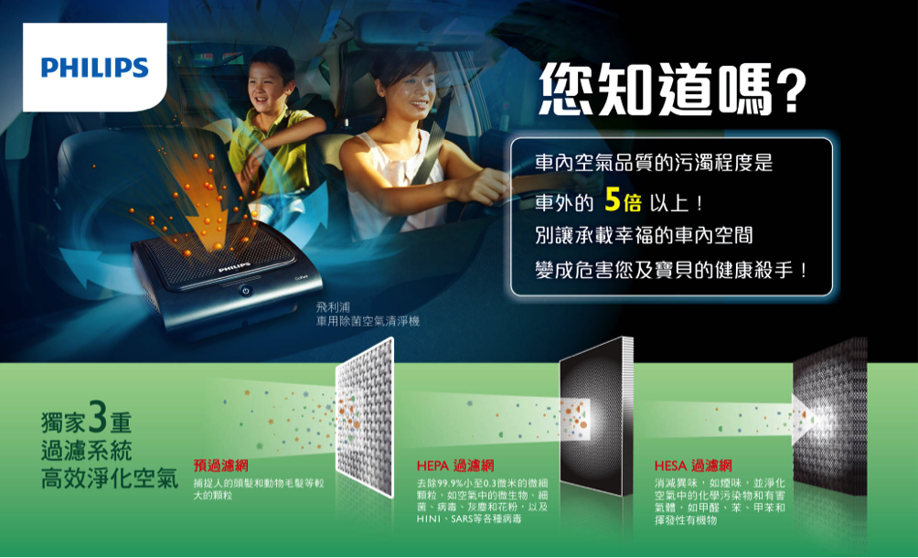 飛利浦車用除菌空氣清淨機獨有的三重過濾技術,可以有效協助您消除車內PM2.5及化學有機氣體等有害髒空氣,同時減少車內異味,還給您和您的家人應有的純淨健康駕乘空間。