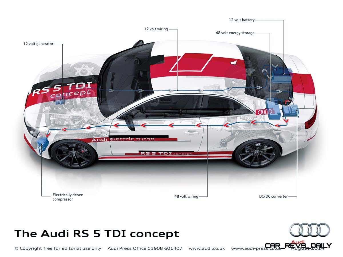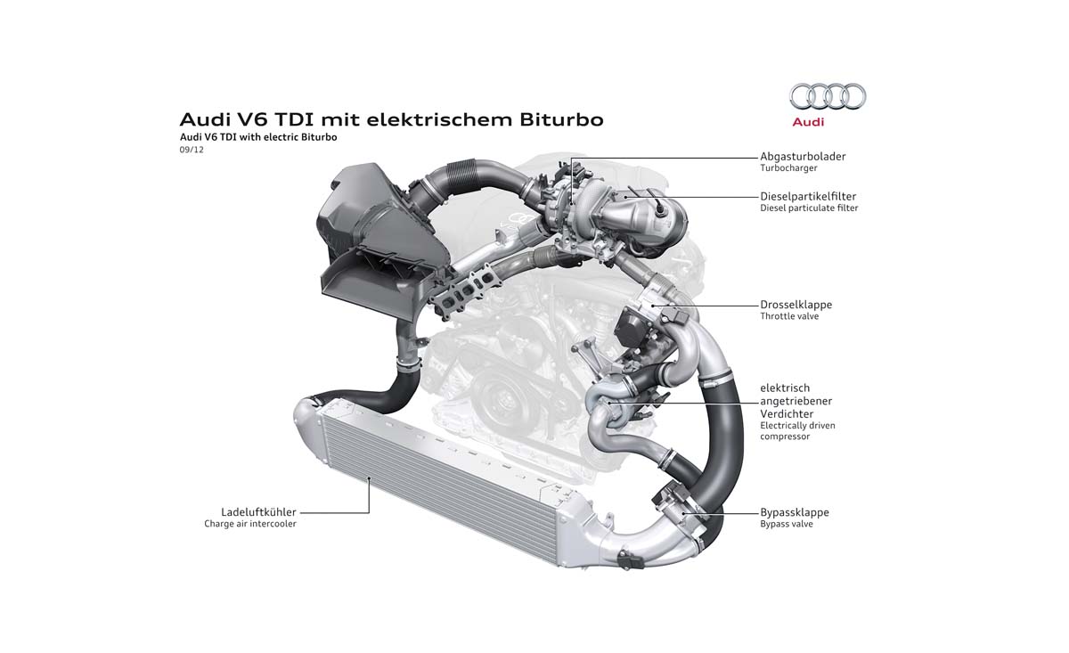 Audi工程師更設計出,當引擎轉速攀昇至足以使安裝在排氣系統上的渦輪增壓器發揮作用時,位於中冷器後方的旁通閥就會打開,有效運作的廢氣渦輪增壓器從此時開始接手電動渦輪;第一款採用電子增壓器的量產車型將是Audi SQ7(2016年問世)。