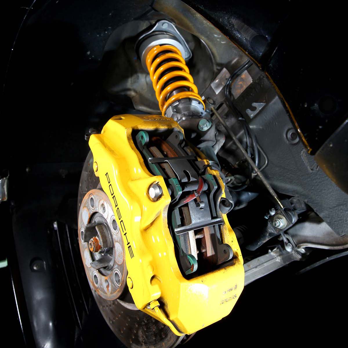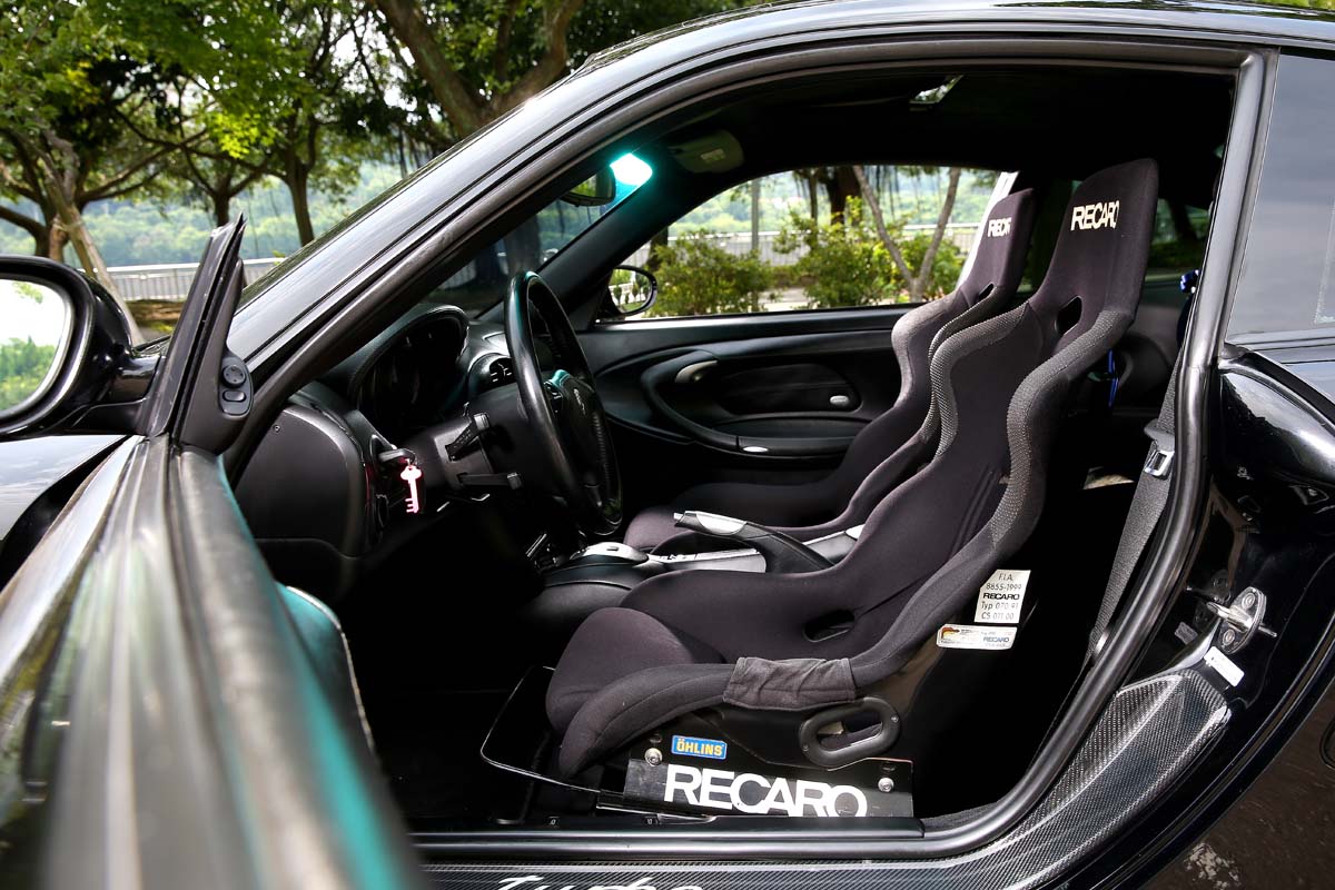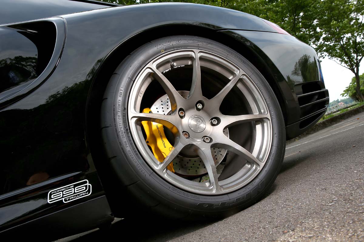 為了應付超過100kgm的扭力,足下的強化這次黑桃可不敢偷懶,瑞典製Ohlins避震器來應付台灣顛簸的路面,制動則是將前輪更換上GT2對向6活塞卡鉗,後輪則是維持原廠對向4活塞,並且搭配上Project u來令片及前後380mm碟盤,輪圈的部份為了要容納315mm的NT01輪胎,特別向BC訂製996T專用的18吋鍛造輪圈。