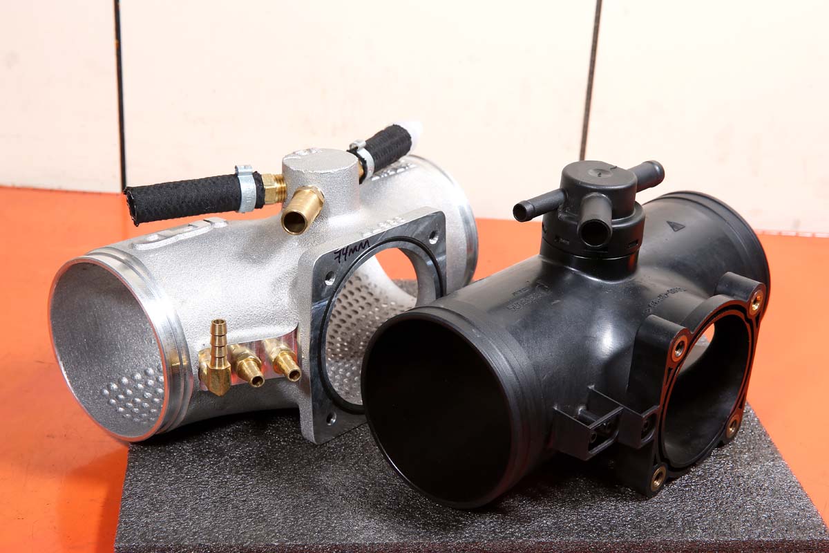 為了應付兩顆Tail 3076超高的2.0bar所帶來的強大吸力,進氣管路上兩顆SQV就必須隨時待命將多餘的空氣排出來保護渦輪葉片,並且996T原廠T管在超過1.6bar後就會因為高壓導致上方接頭爆裂,因此黑桃建議會更換上鋼製材質的IPD強化T管,另外更厚的節氣門固定座部分,可容納更大規格的節氣門。