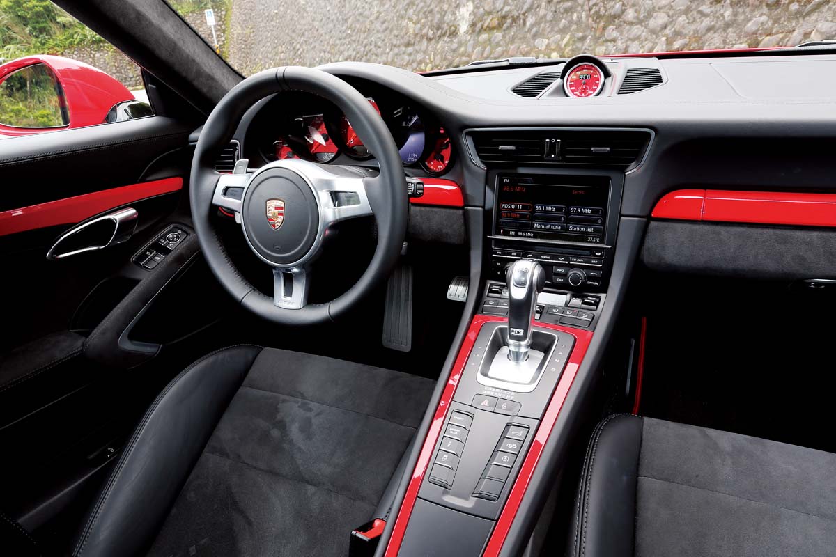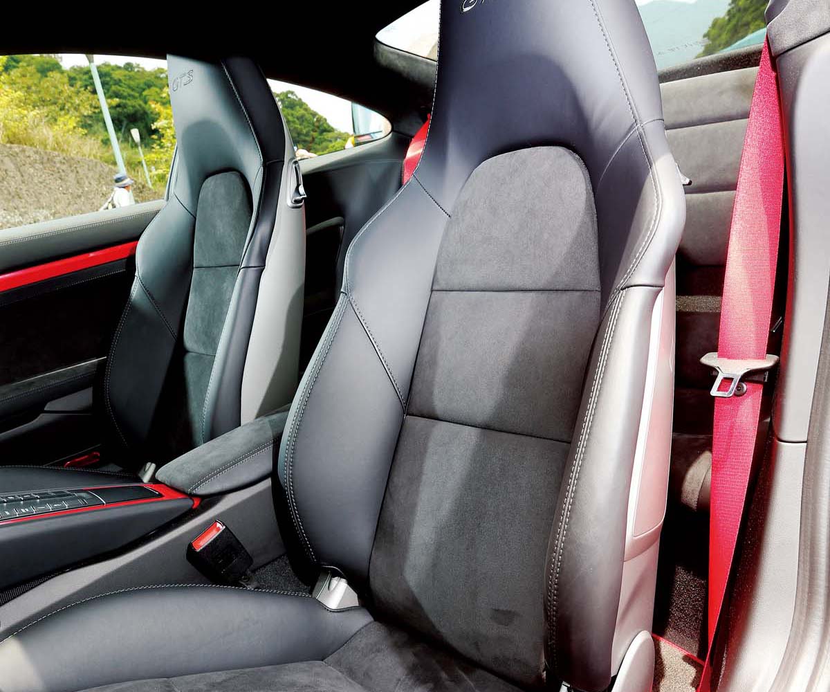 車艙內部的設計跟一般的911相同,但是為了強調運動氣息,在門板、座椅以及中控檯下半部都採用Alcantara包覆,一方面換取熱血的視覺感,另一方面,在座椅等處使用Alcantara,則可以提昇椅面的摩擦力,在激烈駕駛時可以抓住駕駛人。