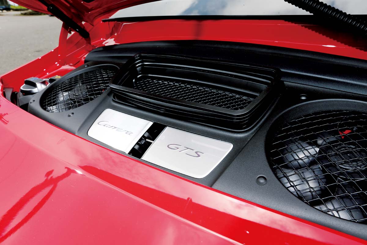 GTS跟一般Carrera不同之處在於大量專屬的配件與內外設計,其中最容易注意到的是全車外觀的黑霧化配件,包括前保桿中央部位額外加上大型進氣口、黑色的大燈內膽、單螺絲固定20吋輪圈、特別設計後下擾流與後保桿,而其中最讓911車迷感受到懷舊氣氛的,則是特製的引擎蓋採用了經典911的細格式散熱網,帶來了不同於一般車型的視覺感受。除了妝點式的配件外,GTS也搭配了寬體車身,不只帶來了更具力量感的車身造型,也帶來了更好的空力效果。