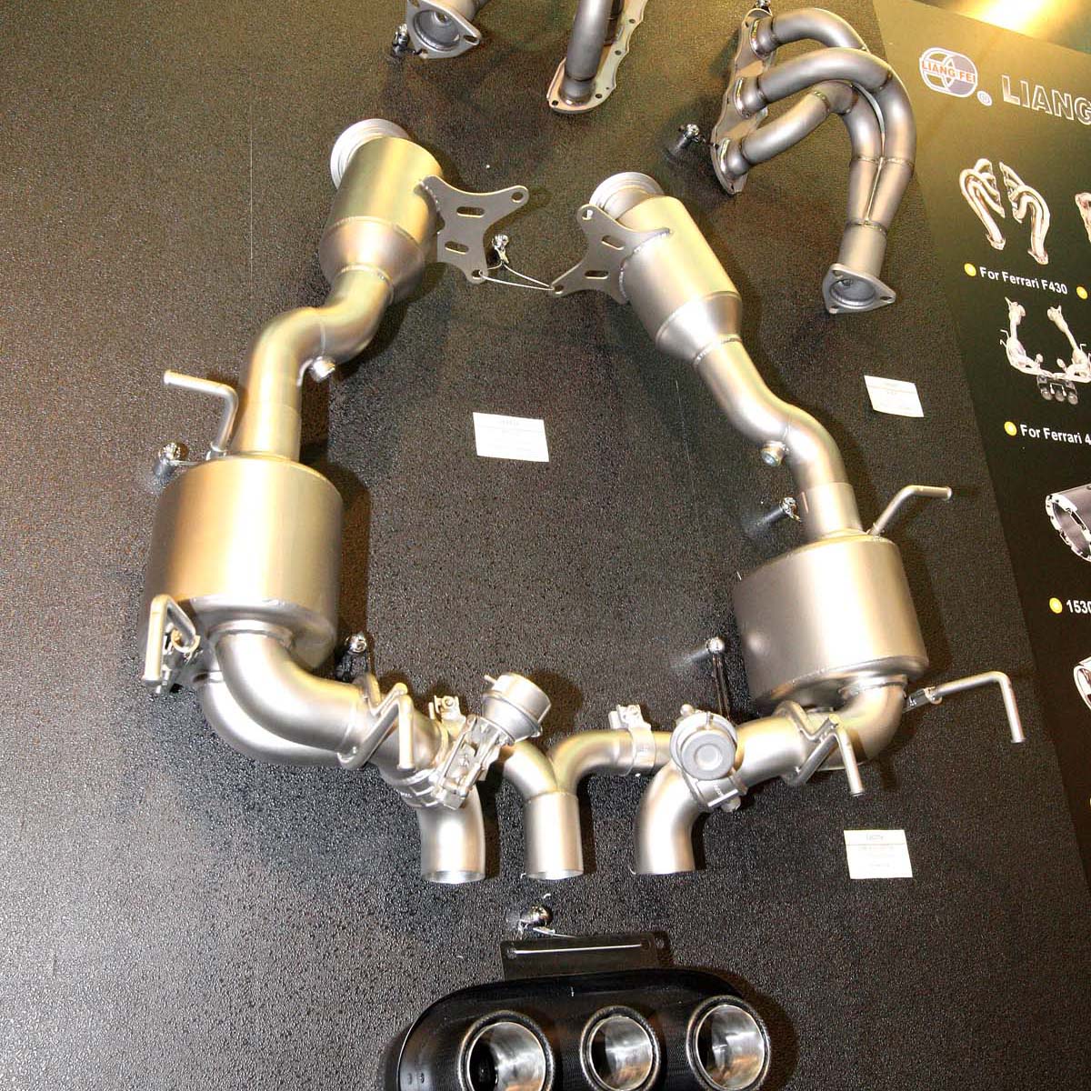 | 隨著改裝風氣吹向高單價超跑,為此良飛今年特別展出Porsche頭段與Ferrari 458專用中尾段。 |