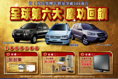 三陽現代汽車為慶祝現代集團全球新車年銷售量突破380萬輛的新高記錄,在繼2007年歲中推出『有夠精采專案』之後,再推出『LG家電千萬好禮三重送』回饋活動;讓現代汽車的支持者及顧客有機會一舉三得。