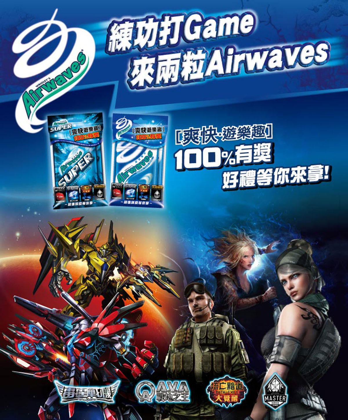 清涼醒腦的Airwaves超涼無糖口香糖,陪伴你我度過許多熬夜考試、連續打怪闖關…等亟需打起精神繼續奮鬥的時刻,尤其深獲玩家們的青睞。練功打怪時來兩粒Airwaves超涼無糖口香糖,包準讓人精神為之一振,信心大增,闖關勇猛無敵!這波Airwaves「爽快・遊樂趣」活動,破天荒地打破以往單對單的兌獎模式,與三大遊戲結合,並以100%中獎率來回饋大家。即日起至2015/09/30,民眾可至全台各通路購買【Airwaves限量電玩包】,憑袋內序號卡上序號登入活動網站(http://events.ettoday.net/airwaves/),即可選擇參加「英雄聯盟2015 LMS區域選拔賽」600張門票抽獎,或任選《A.V.A 戰地之王》、《雷霆戰機》、《流亡黯道PoE》三款遊戲其中之一兌換虛寶序號乙份,再持虛寶序號至各遊戲兌換遊戲虛寶;每組序號僅供登錄一次,可兌換一款遊戲的一款隨機虛寶,100%中獎率。最高可獲得雷霆戰機鑽石5,000顆、AVA戰地之王紅色票卷200張、或POE流亡黯道的雷電靈蠍。(*「雷霆戰機」一個帳號最多僅能兌換三次)