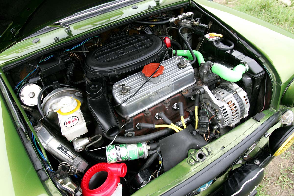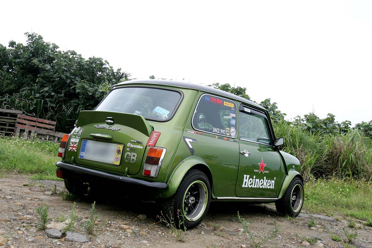 大家對於這輛海尼根彩繪的Austin Mini應該不陌生,國內許多大型車聚都可以看到此車的蹤跡。這是車主的第三輛Austin Mini,而且是1.3L MT車型,由於對Austin Mini有著深厚的情感,於是決定來個大改特改。配合海尼根綠的車色,引擎室內的水管、真空管也訂做綠色製品,而阿玥有一天把海尼根喝完,就索性套在點火考耳作為裝飾;內裝經過非常細心的搭配,儀錶為原廠製品,不像多數車友會改裝Smiths儀錶,而座椅流用Mazda RX-7原件,裝在Austin Mini上還挺有感覺的。