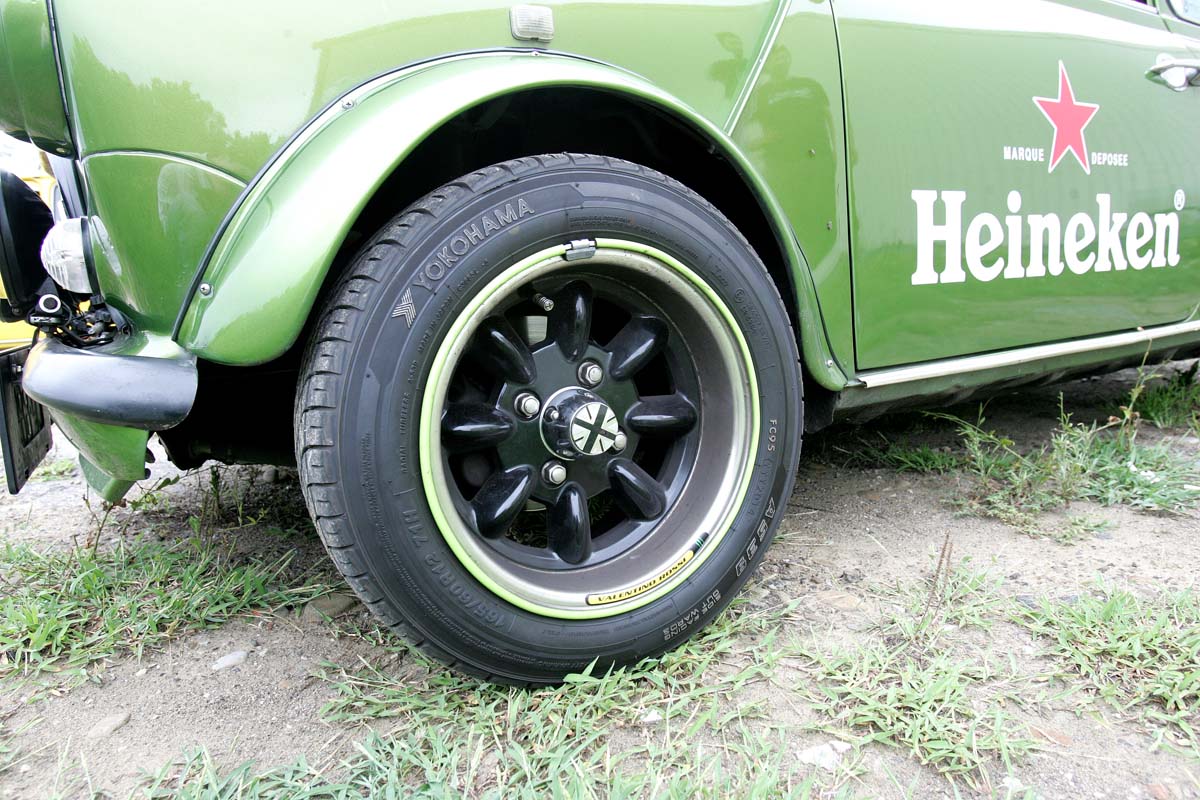 | 12吋鋁圈配上165/60 R12輪胎,抓地性能對這輛小車來說已經足夠,煞車系統也已改裝了AP Racing對向四活塞製品,這輛Austin Mini的底盤極限相當高喔! |