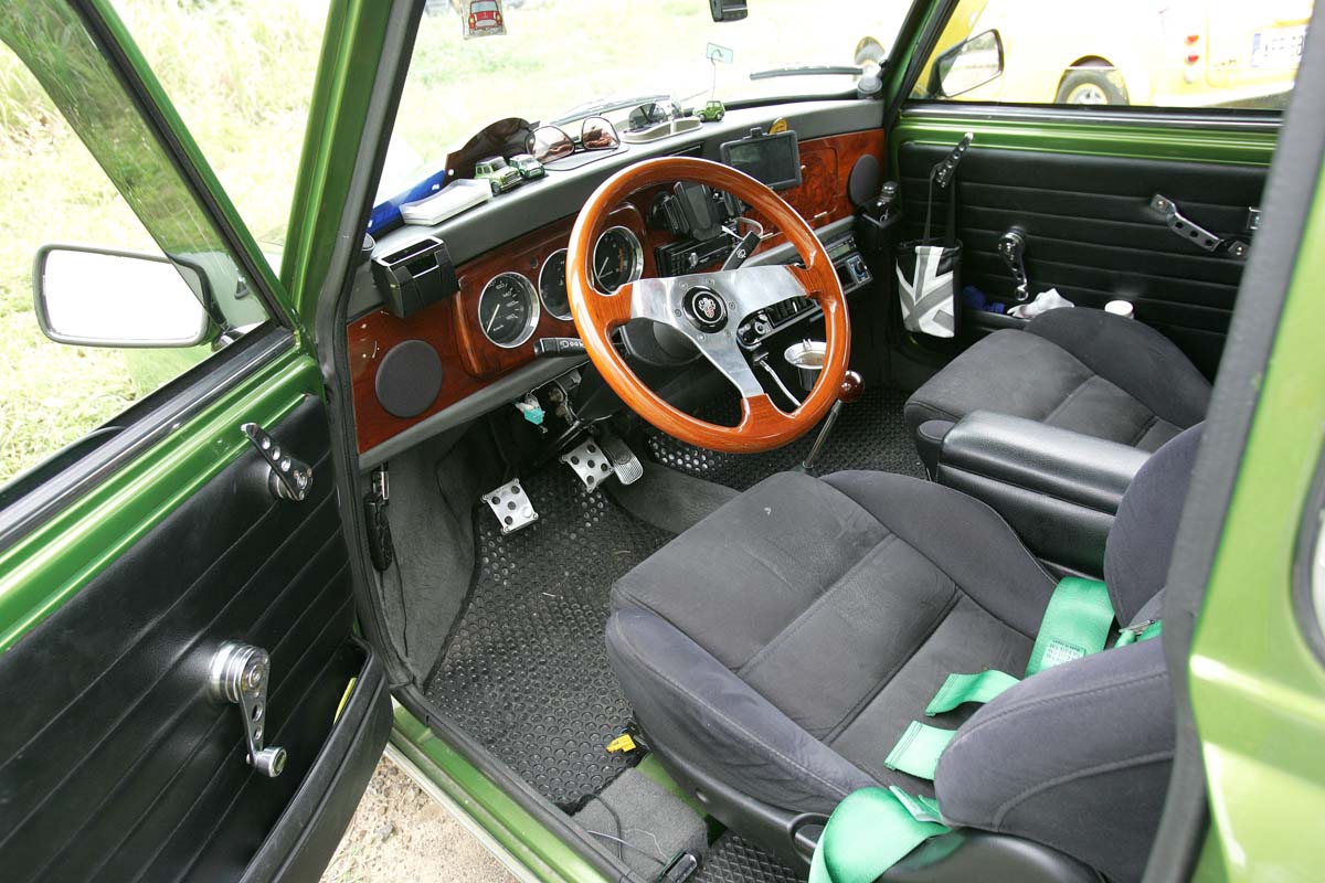 | 原廠儀錶板、核桃木飾板搭配同色方向盤,兩張流用自RX-7的座椅配黑色內裝,乍看之下已經不像Austin Mini的內裝了。 |