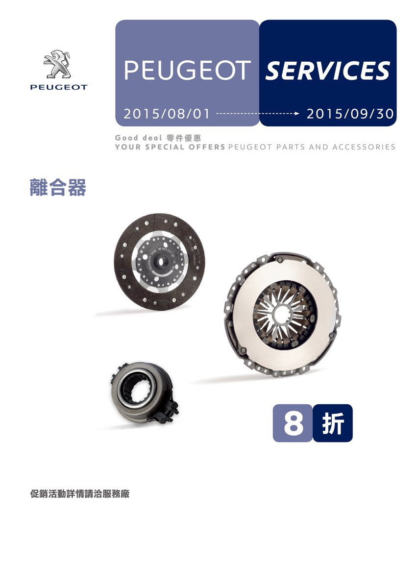 2015年PEUGEOT SERVICES原廠零件優惠活動8 ~ 9月推出離合器零件8折優惠,歡迎車主於活動期間內至PEUGEOT全台授權服務廠由專業技師提供離合器檢查及建議。原廠零件優惠活動相關詳情,請洽詢PEUGEOT全台授權服務廠。
