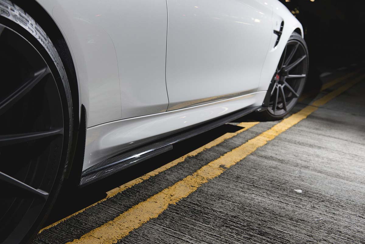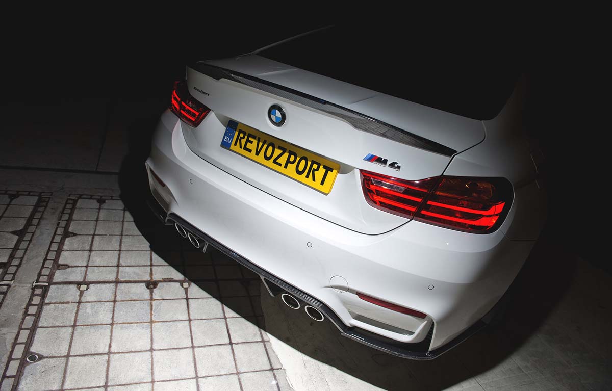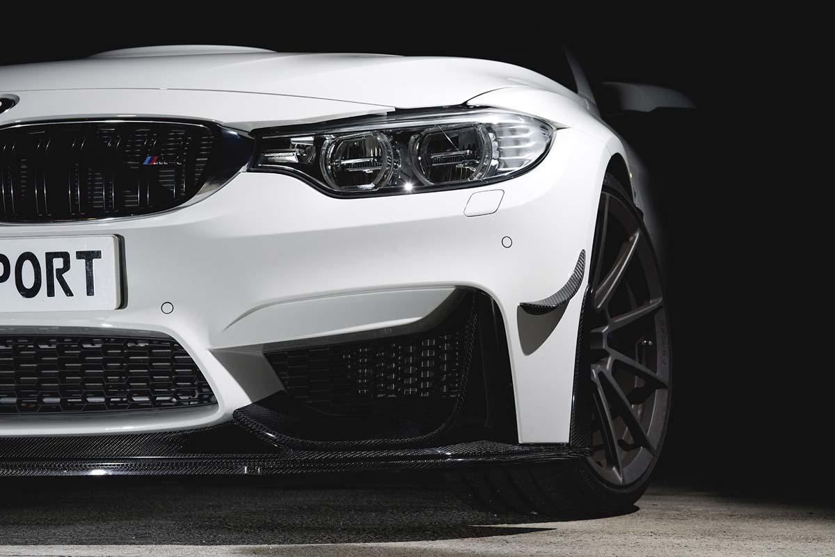 包一圈性能倍增是一個怪怪的邏輯,若是因此激發腎上腺素,便不怪了。M-Power是所有Bimmer迷的最愛,除了有絕佳動力輸出、底盤操控之外,M-Power獨有的優美身形更是大家所喜愛,而RevoZport這套M空力套件,能使M3/M4變得更兇狠、更具侵略性。RevoZport在前保桿下方加上一支碩大的擾流板與兩側定風翼,主要用來增加車頭下壓力,而RevoZport在保桿內側加裝進氣管路,用來幫助前煞車系統快速散熱用,至於車身下擺部分,從車頭、車側到車尾一整圈定風翼,加上碳纖維材料的特殊紋路,高質感呈現,而RevoZport在行李廂蓋上加上一支碳纖維鴨尾,如果覺得不夠兇猛,還可以加裝可調翼面的GT尾翼,讓M3/M4有如廠車般的誇張。