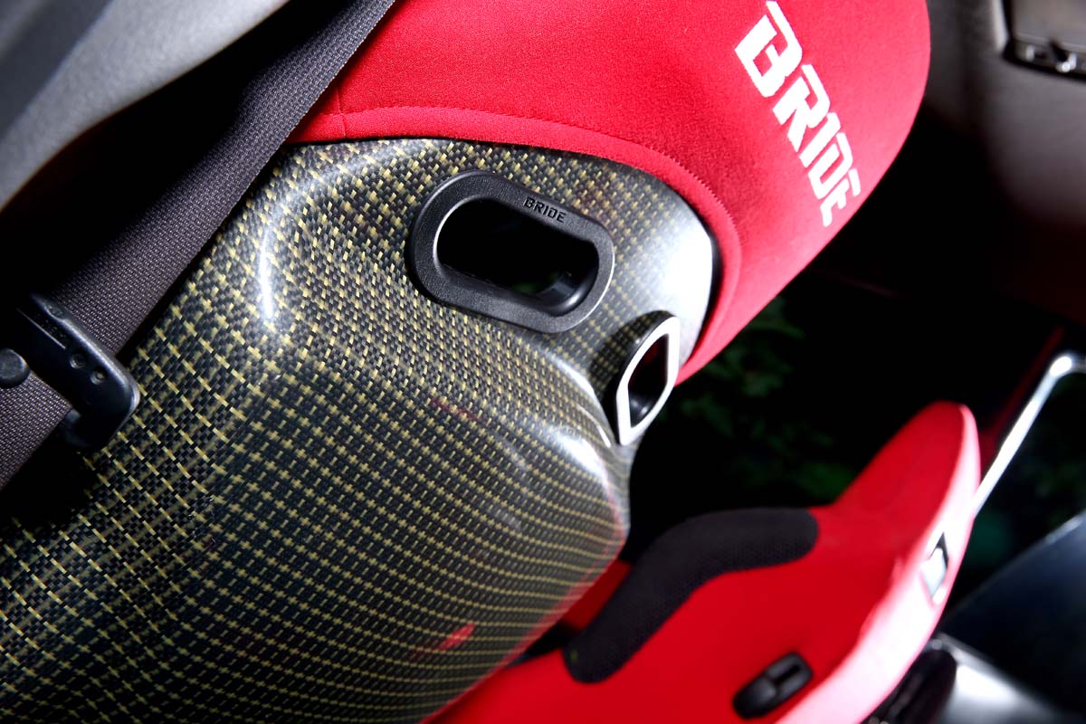| SHEET 座椅 大量的火紅色配色是車主的堅持,除了4個藍色麂皮的STI門板都被施以紅色麂皮換裝外,賽車椅也一併更換上紅色配色,Bride火紅色功夫龍怪獸椅更是相當顯眼,功夫龍椅背與紅色塗裝搭配下更凸顯強烈的運動格調。 |