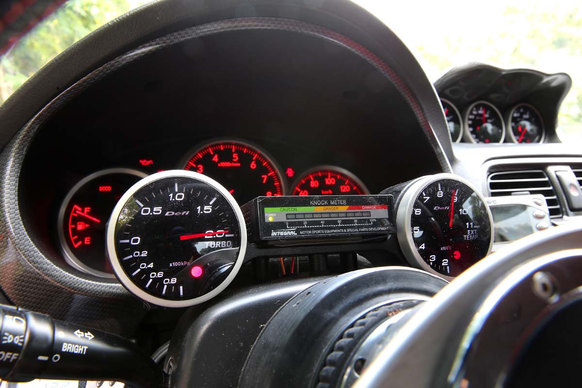 | METER 儀錶 日規高反差儀錶黑底紅字光看就很爽,除此之外車主也追加Defi 5顆高反差儀錶來監控引擎狀態,而在增壓錶及排溫錶中間的正是大改車輛最愛的爆震監看器,隨時可透過中間隔數的高低來判斷目前車輛狀況。 |