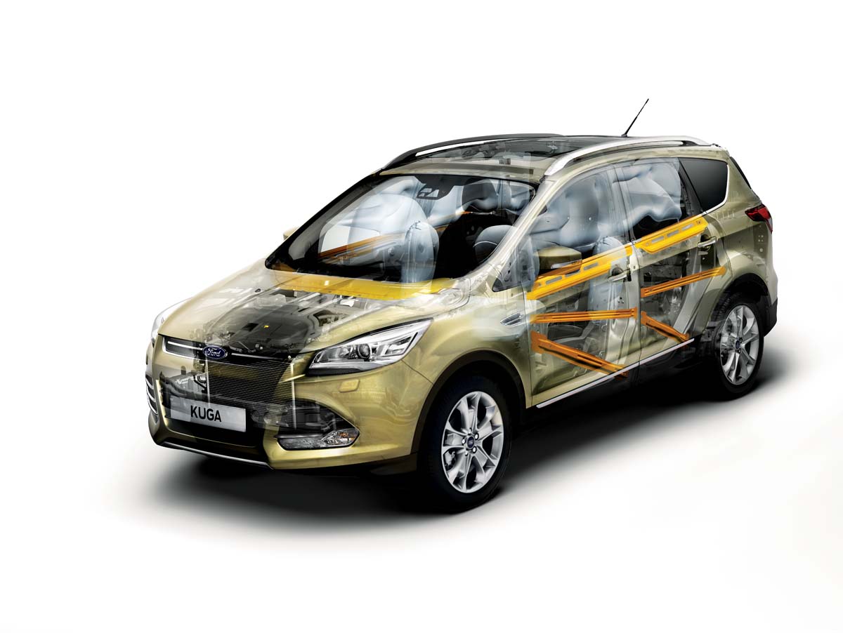 由高科技所打造的主動安全科技以外,要達到全方位的安全防護,當然也少不了被動安全科技。對此,Kuga配備了高強度的車體,與遇到撞擊會自動潰縮降低駕駛傷害程度的可潰縮式方向機柱與腳踏板以外,還有包含駕駛座膝部在內、最多達七具的SRS防護氣囊,將撞擊時產生的能量盡可能吸收,降低對於車內駕乘客的傷害程度。