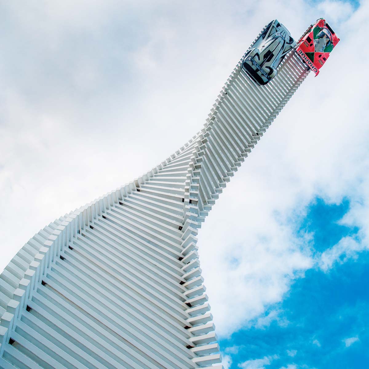 | 今年活動的最大贊助商Mazda,在會場架起了由418支鋼梁向上螺旋堆疊而成的37公尺高雕塑作品,頂端更擺放了2部Mazda LM55賽車來展現向前衝刺的震撼意象。 |