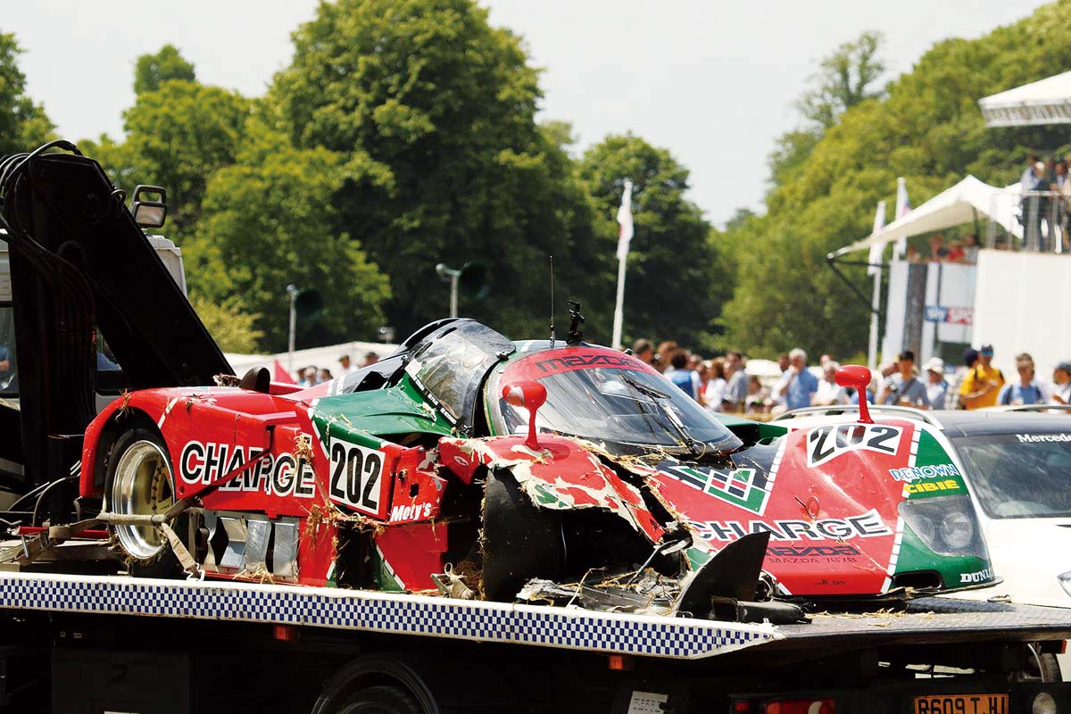 | 在1989年奪得Le Mans GTP組冠軍的Mazda 767B,在此次動態展演中不幸失控撞入乾草捆護欄中,造成車頭整個毀損。 |