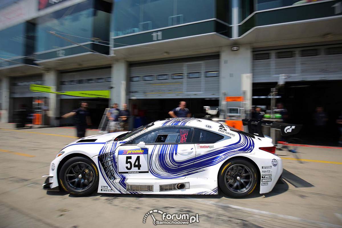Lexus預備明年進軍全球GT3、GTE Pro賽事的RC F GT3賽車,搭載自然進氣式樣的5.0L V引擎,在FIA Air Restrictor進氣限喉器的限制下,馬力峰直達540hp,相較於Gallardo LP600 GT3的530hp、SLS AMG GT3的500hp或GT-R GT3的530hp,可說是一點都不遜色,搭配大量採用碳纖材質,使車重降到FIA規定的最低車重1250kg,馬力/重量比的表現也夠格與它廠GT3賽車一戰,此次現身德國VLN Endurance Series耐久賽事,除了展現動態英姿外,也是第一次在正式賽事現身。