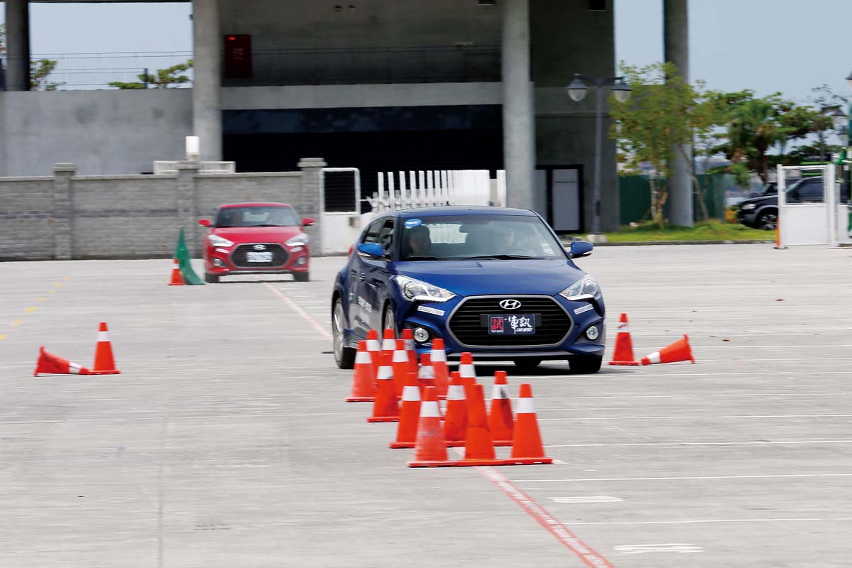 繞錐動態上,原廠將錐筒間隔從35公尺依次遞減到20公尺,在快速繞錐過程中體驗重心變換的底盤極限,筆者在最後一個錐筒因為速度過快沒辦法依循路線完成繞錐時,發現Veloster Turbo搭載的VSM整合式車身動態管理系統,在失控時會抑制引擎輸出,讓車身動態不至於無法挽回。因此在最後一道關卡大鵬灣No.7低速髮夾彎時,筆者刻意將ESP電子穩定控制系統關閉,就在全油門出發時,引擎聲浪變得更激進,而車輛動態反應也更加直接,就算偏滑失控,底盤回饋與轉向指令間的合作彷彿少了一道傳聲筒更加清晰俐落。一般道路駕駛時,關閉ESP可能會帶來更高的失控風險,若非封閉安全環境建議維持開啟。