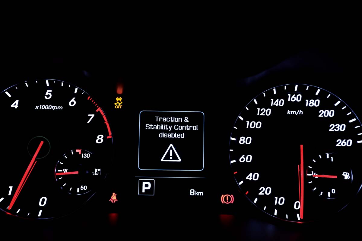 | ESP電子穩定控制系統在Veloster Turbo身上分為三段作動:開啟、延遲介入、關閉,關閉後儀錶如圖所示。 |