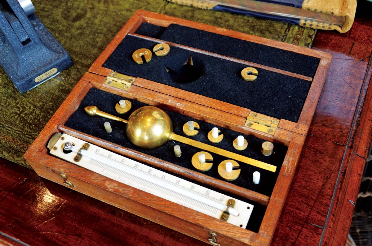 | 以前沒有精密的電子儀器可測量酒精濃度,就是靠桌上這一套工具測量的,測量結果配合對照表就可清楚得知受測品之酒精濃度。 |