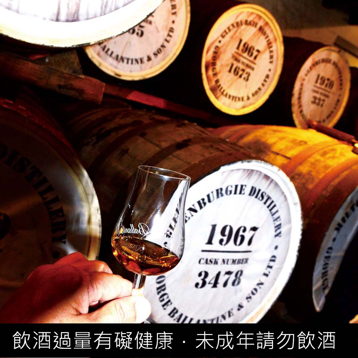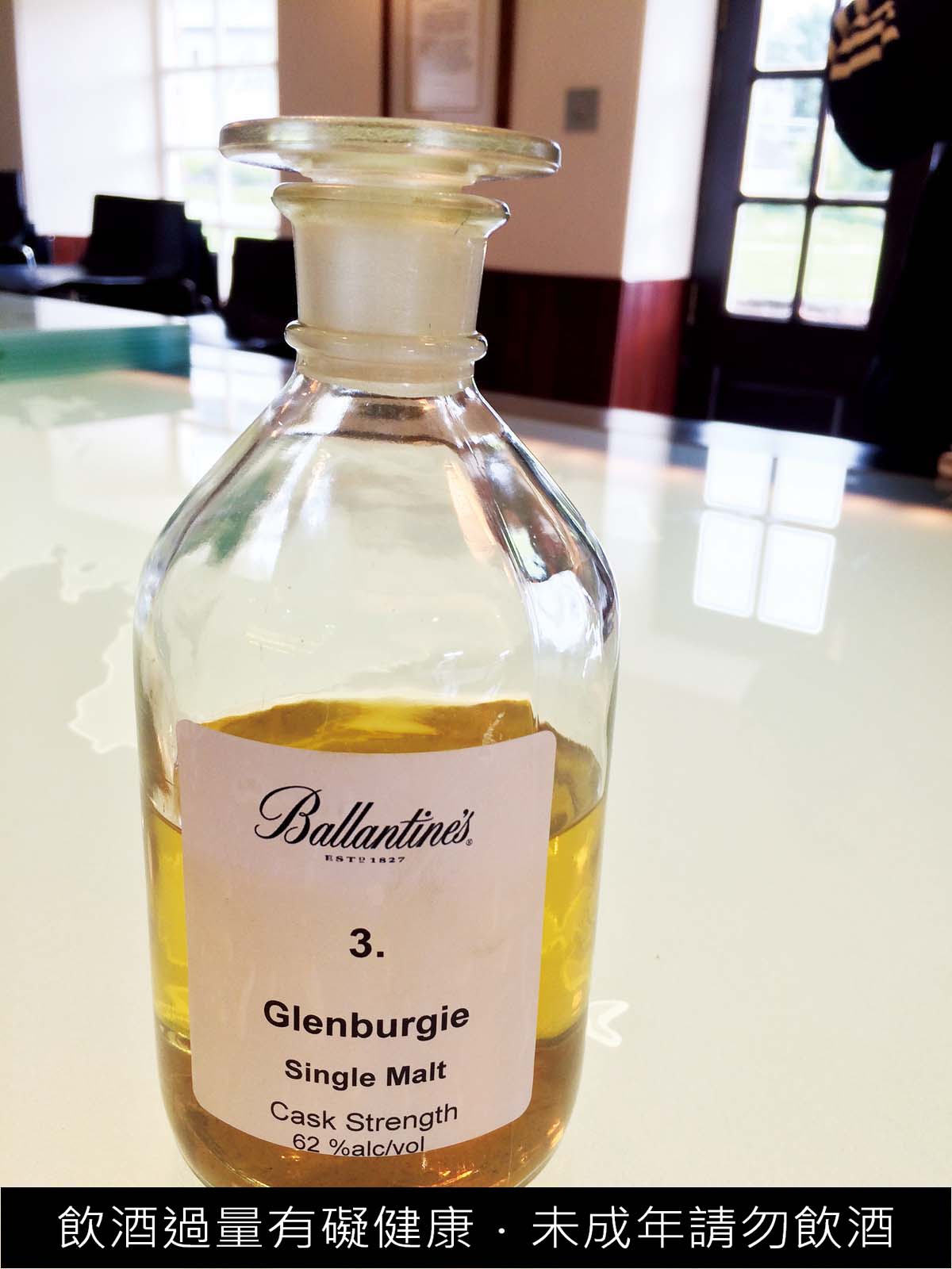 為了更進一步體驗Glenburgie原酒的風格及魅力,在百齡罈特別招待下,此行很幸運地先後品飲了未標示年份、1967年份兩款桶裝原酒。進入品項多到數不清的樣品室,在原,隨意打開第一支色澤金黃、未標示年份、濃度高達62%之樣品酒,伴隨而來的是一股濃郁雅緻的清甜花果香氣,與百齡罈17年所呈現的香甜氣味如出一徹,但氣味則更為濃郁誘人,飲下後,濃郁的甜香在口中逐漸散去,取而代之的是順暢的口感,我想我可能喝到百齡罈17年的「秘密」了!之後在原廠人員的帶領下進入地窖,當場直接開桶品嘗1967年原酒,這支酒琥珀色的原酒帶著濃冽的蘋果香氣,極為迷人,而其豐厚的油脂口感及溫潤的喉韻縈繞在口中久久不散,讓人見識到48年威士忌令人無法擋的魅力及Glenburgie深厚的造酒工藝。
