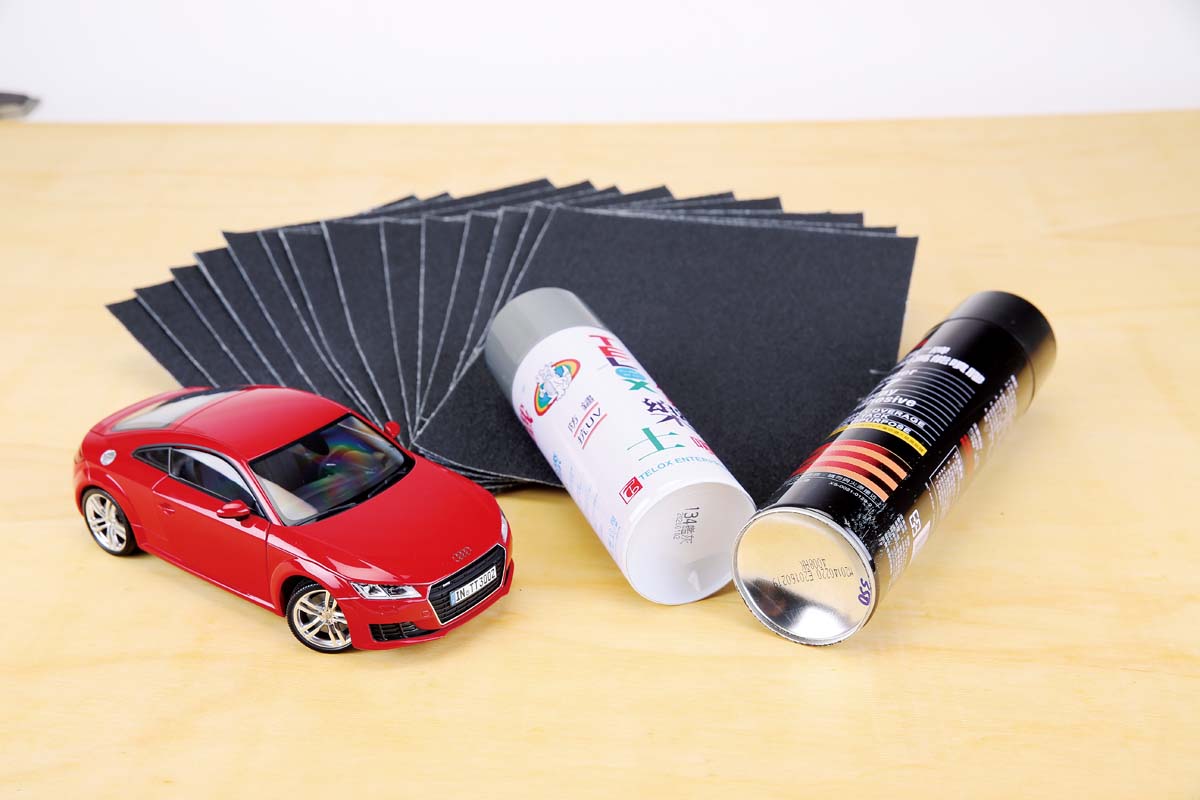 | 以1:18的模型車來說,40號的砂紙所呈現的顆粒感,最符合實車與柏油路的比例,因此選擇適當的木板後,再施以貼合與噴上灰漆,即可完成擬真的柏油路面。(噴膠與噴漆屬有機溶劑,請注意配戴安全護具,並於通風良好之處作業,以維護健康) |