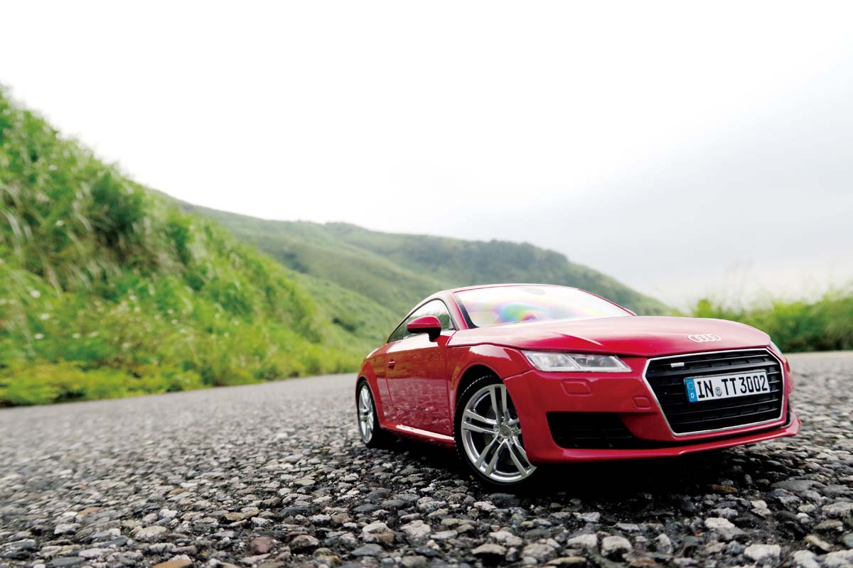 | 在8月號的模型車拍攝中,我們提到避免使用微距(小花)模式拍攝,如此的手法會因相機過於靠近車體,使得地面的柏油路顆粒過大,造成比例的不對稱,因此建構一條符合比例的柏油路面,是拍攝模型車的入門重點。 |