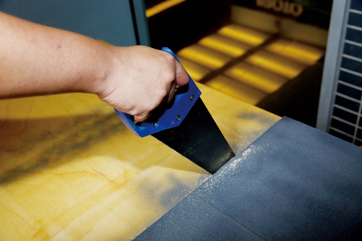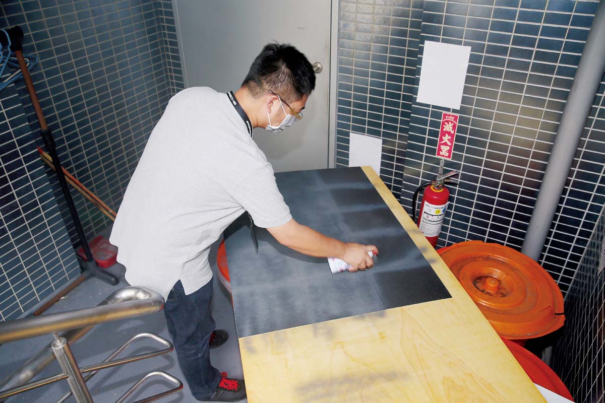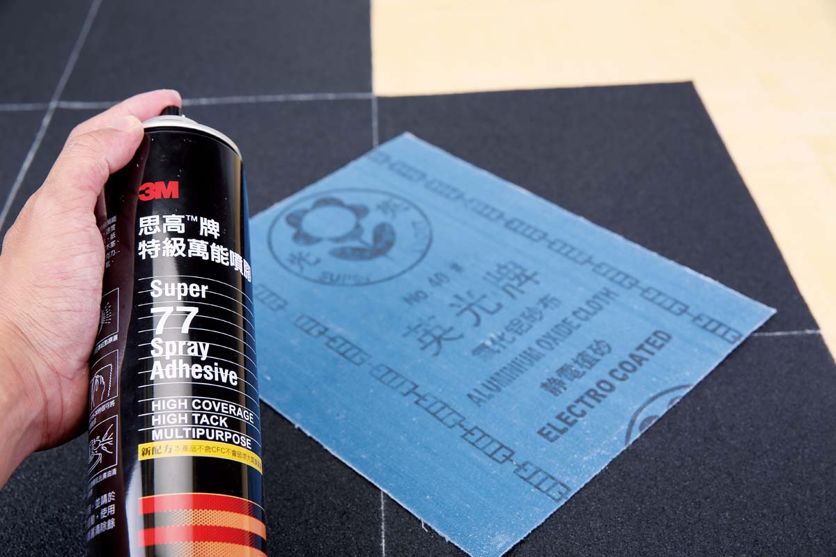 大家都知道在馬路上鋪設柏油路時,讓砂石與地面緊密結合的介質就是柏油,所以我們還需要將砂紙緊密的黏著在木板上,而如何將砂紙平整的貼合在木板上?噴膠會是非常好的選擇。為何不選擇木工常使用的白膠呢?因為在塗佈白膠時,容易因為上膠的厚度不一,造成貼合時會有高低的起伏,令路面產生不平整現象,因此以噴膠來回在砂紙背面上進行噴塗會是較為恰當,且易於施工的選擇。