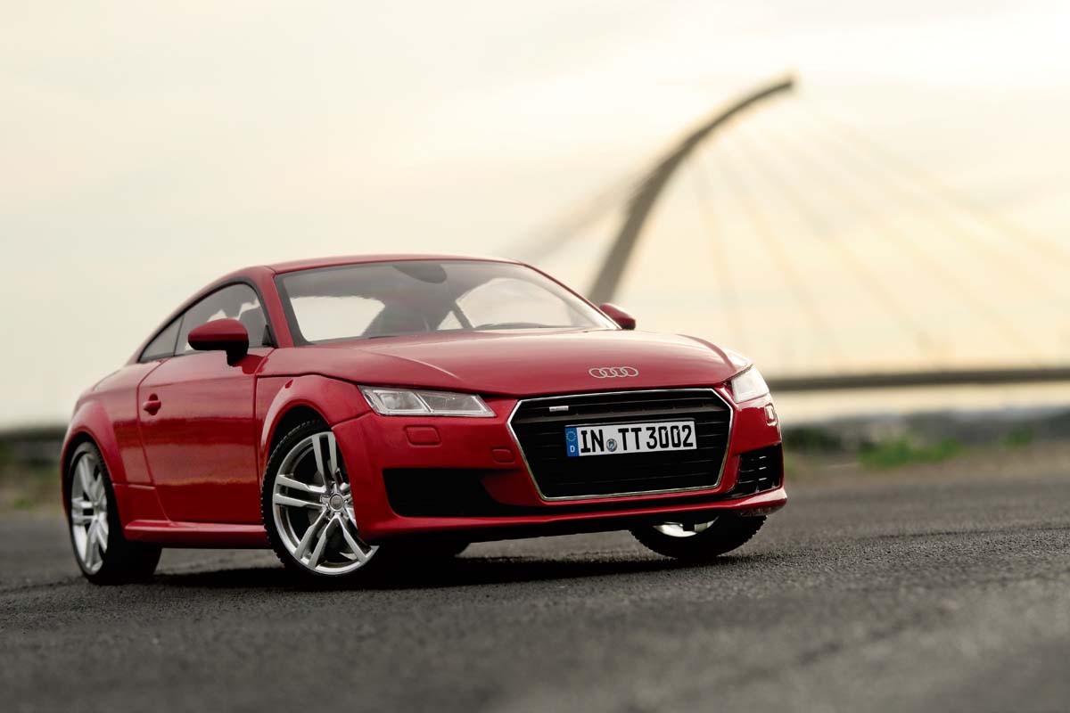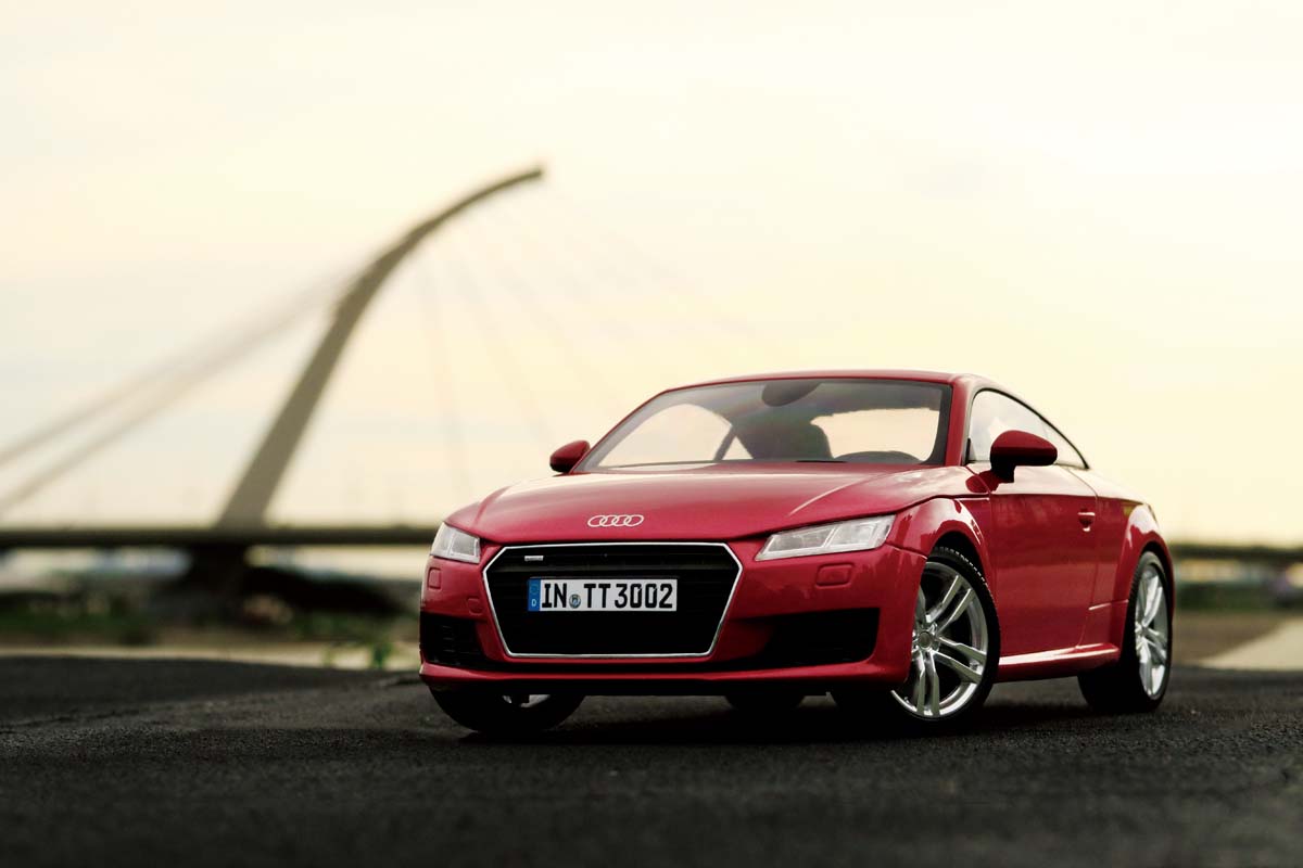 完成柏油道路建置後,我們在上一期的拍攝有提到,要使用相機鏡頭最長的焦段,以及選擇正確的光線時段來進行模型車拍攝。本期在柏油路建置下,拍攝模型車時須注意幾點,首先將板子須與背景有相當程度的距離,令背景比例符合模型車之大小,接著為取得較佳的前景道路感,模型車放置的位置,以靠近木板末端為佳,相機的拍攝角度則與模型車中心高度同高,如此便可讓砂紙展現近似於真實柏油路面之顆粒感,最後設定好木板的擺放位置、模型車與相機的角度後,在相機光圈之設定上,則是依照現場與背景的景深感,進行調整光圈縮放,令背景的整體畫面帶有些微的朦朧感,即可達到與真實汽車攝影的逼真程度。