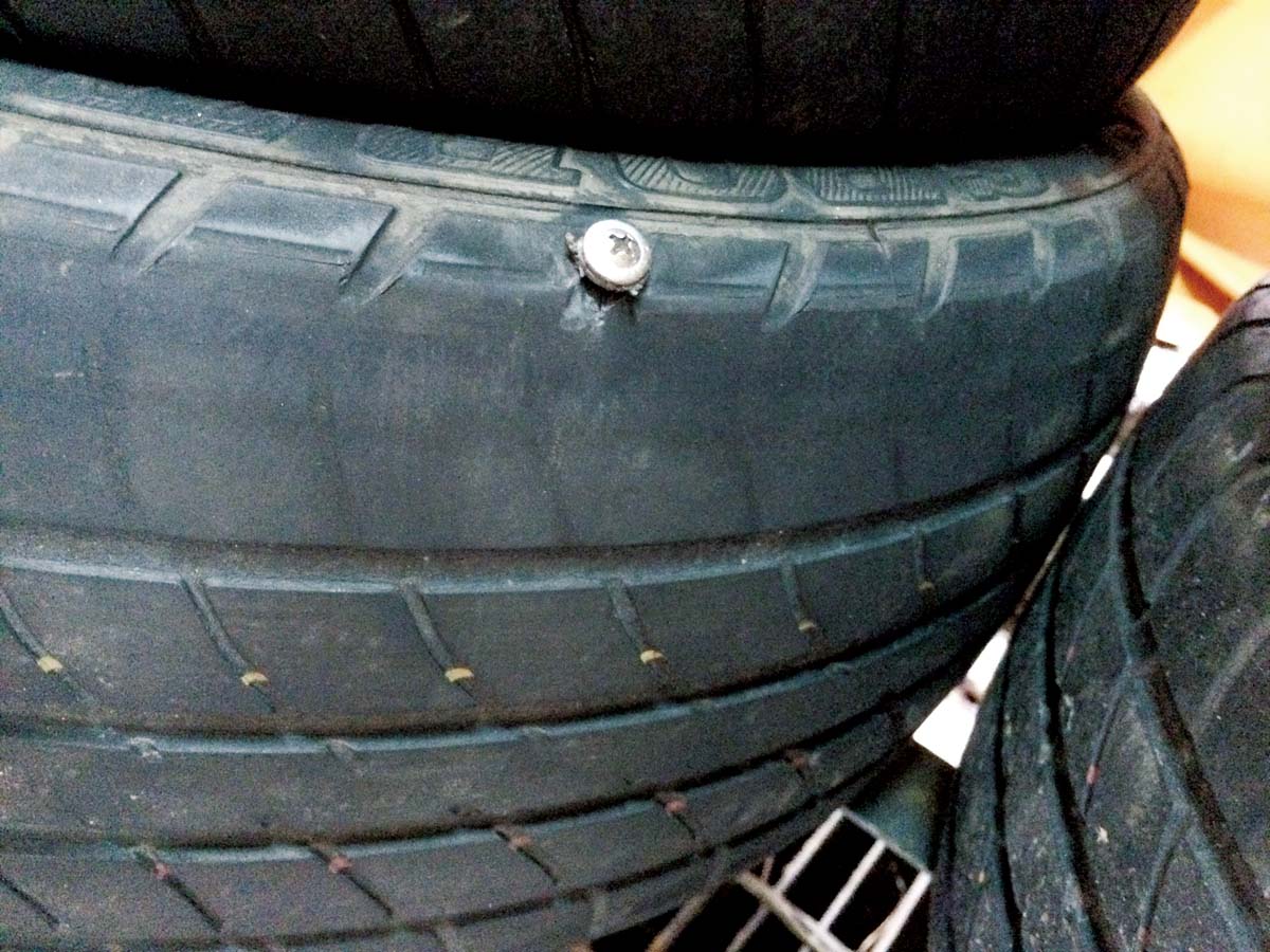 | 上圖釘子插入輪胎的位置即為一般胎面與胎側交接處,若遭損傷建議直接更換新輪胎。 |