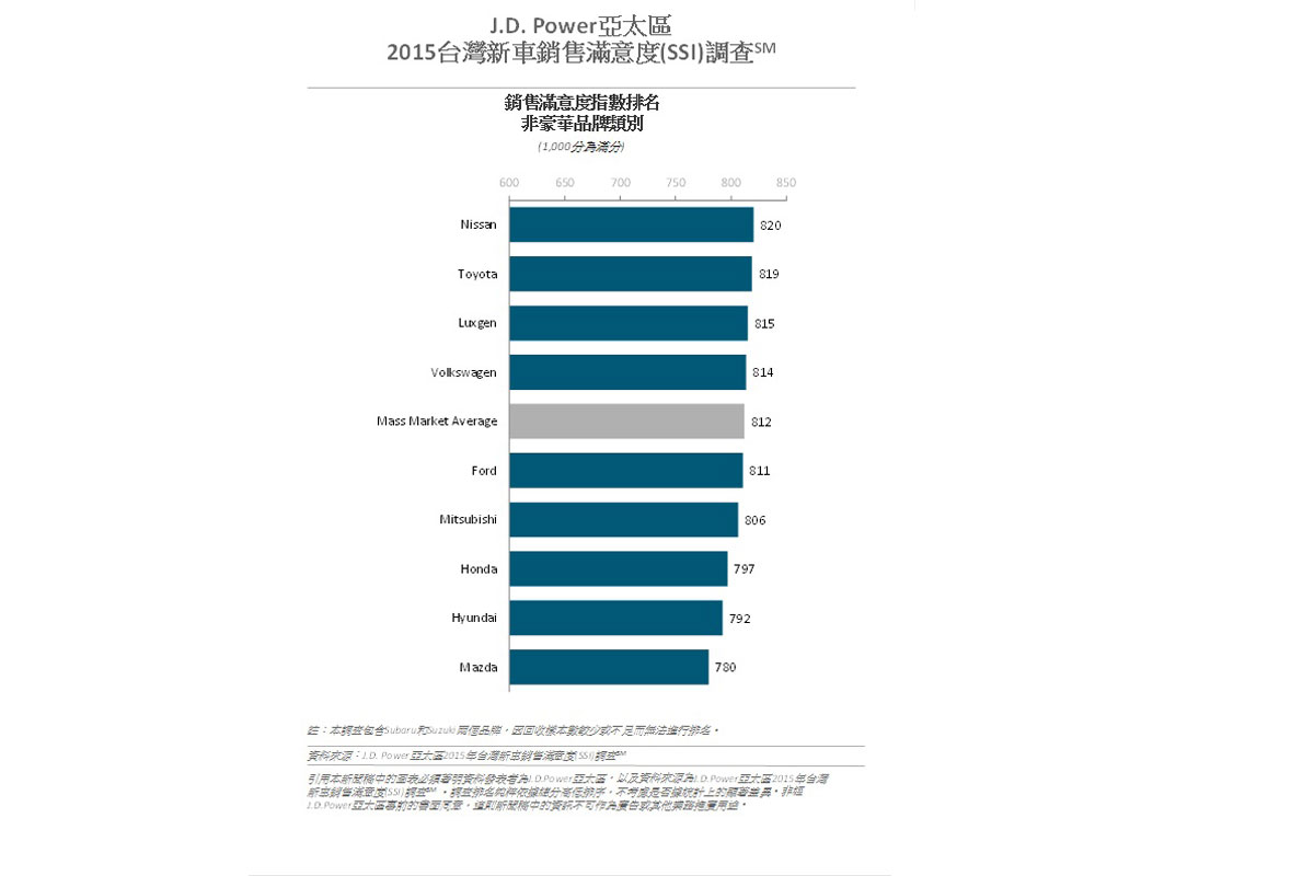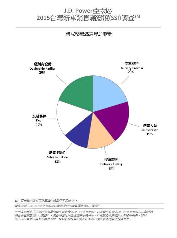 根據今天最新發表的J.D. Power亞太區2015年台灣新車銷售滿意度 (SSI) 調查SM非豪華品牌的結果顯示,台灣新車車主不僅期盼銷售人員在購車過程中詳細解說車款特色與優點,也希望經銷商比較同級車款之間的各項差異,使得銷售人員在顧客做出購車決定上有重要的影響力。