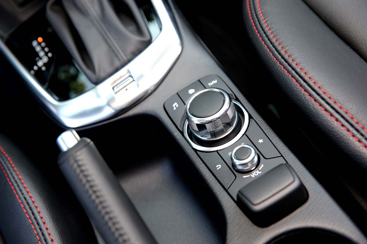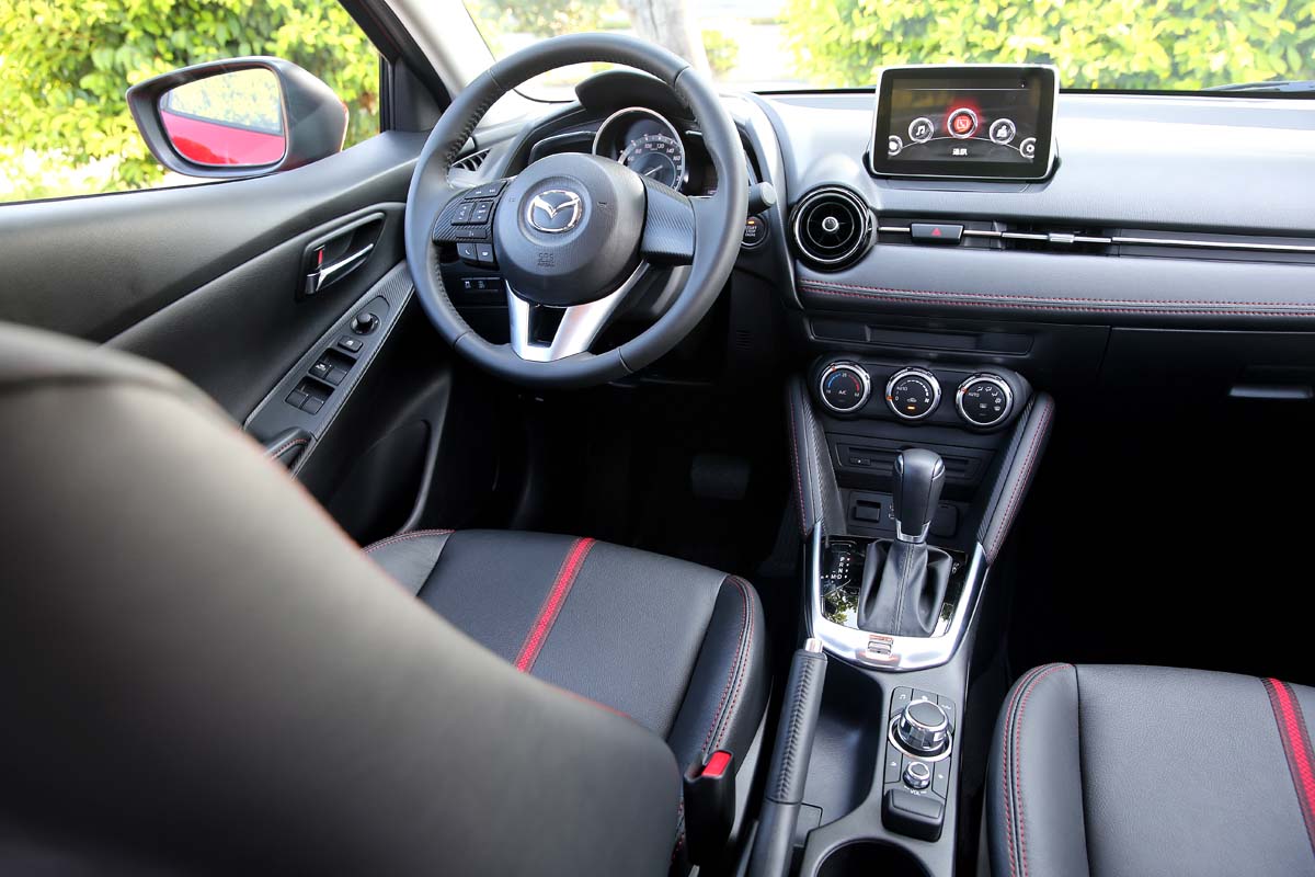 而與駕駛及乘客息息相關的內裝配置方面,既然風格以運動為主,應該有的設計與鋪陳原廠工程師可是一樣都不放過,簡潔有力的三幅式方向盤配合多功能按鍵,除了提供駕駛最佳的方向盤手感,單筒式儀錶板同樣相當引人注意,高性能跑車多會將轉速錶置於儀錶板中間,時速則是數位顯示在右下角,兩側為其它行車資訊,此儀錶設計為Mazda2的運動性做了加分。另外,全新類碳纖維飾板的採用,包含方向盤、車門飾板與中控台等為質感加了不少分數,空調旋鈕的調整、中央鞍座的重新配置等,讓整體操作介面更為就手,All New Mazda2將MZD Connect人機智慧資訊整合系統列為尊爵與頂級車型配備,只要透過中央鞍座上的旋鈕就能顯示各項車輛資訊,增加操作上的便利性與行車安全。而全面精緻化設計的內裝不僅完全顛覆小車的陽春印象,同時更延續馬自達所要傳遞熱血駕馭的精隨。