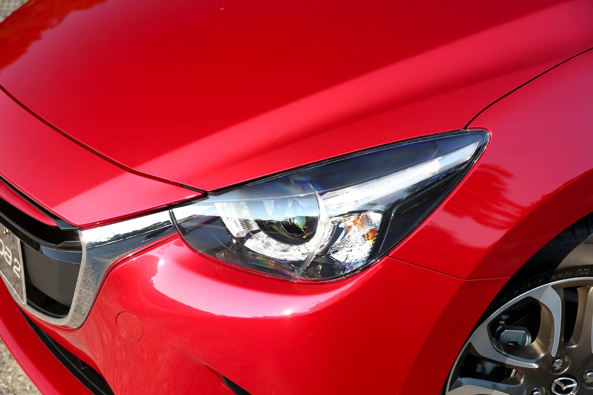 搭配上以操控為樂趣的車輛設定,All New Mazda2在外觀與內裝的設計,除了展現原廠的用心程度,充沛的企圖心更是直指年輕消費族群,以KODO Design-魂動為設計概念的外觀,可以看到外形猶如獵豹奔馳,然而影響外觀最重要的關鍵在於具有畫龍點睛的大燈設計,由於這次試駕車款為頂級型,因此大燈為LED燈具,相較於入門版本的晶鑽型投射式大燈相比,若是手上預算足夠的買家建議直接攻頂,除了外觀上看起來更為與眾不同,也可避免日後還要改裝升級來破壞原有的完整性。