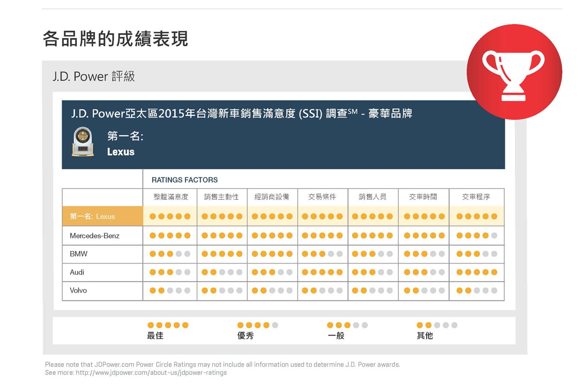 在5個列入排名的豪華品牌中,凌志(Lexus)以854總分拔得頭籌。凌志在經銷商設備與銷售人員等要素上表現尤為優異。賓士(Mercedes-Benz)在銷售主動性、交易條件、以及交車時間等要素上表現出色,以853總分名列第二。其餘BMW排名第三,AUDI排名第四,VOLVO則在此排名中屈居最末。至於銷售量豐碩但未列入排名的PORSCHE,並非不是豪華車,而應是願意接受調查的車主樣本數不足而不在調查評分排名之列。此與美國市場總能見到PORSCHE名列前矛的情況令人覺得稍稍可惜。