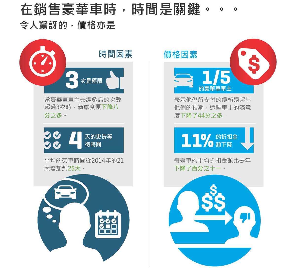 2015年豪華品牌整體銷售滿意度平均為848分。顧客以銷售人員作為考慮購買新車的資訊來源比例達65%,相較於2014年多出7%。台灣新車車主期望銷售人員比較同級車款,並詳盡解說各車款的特色與優點。