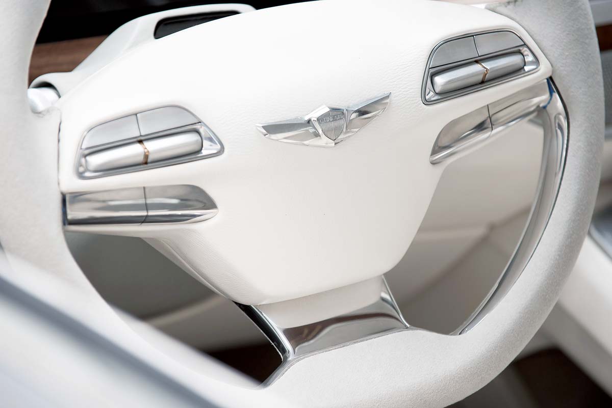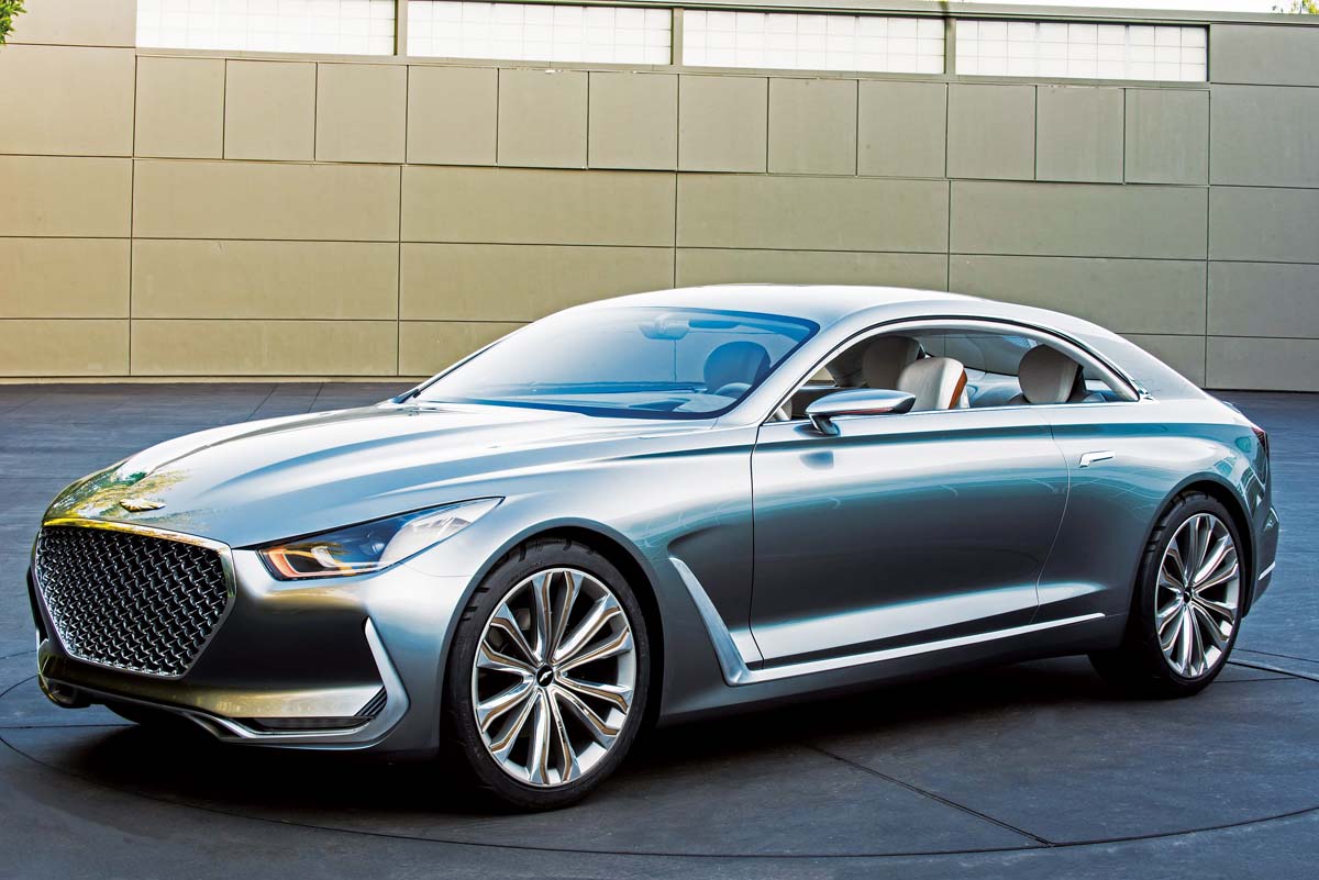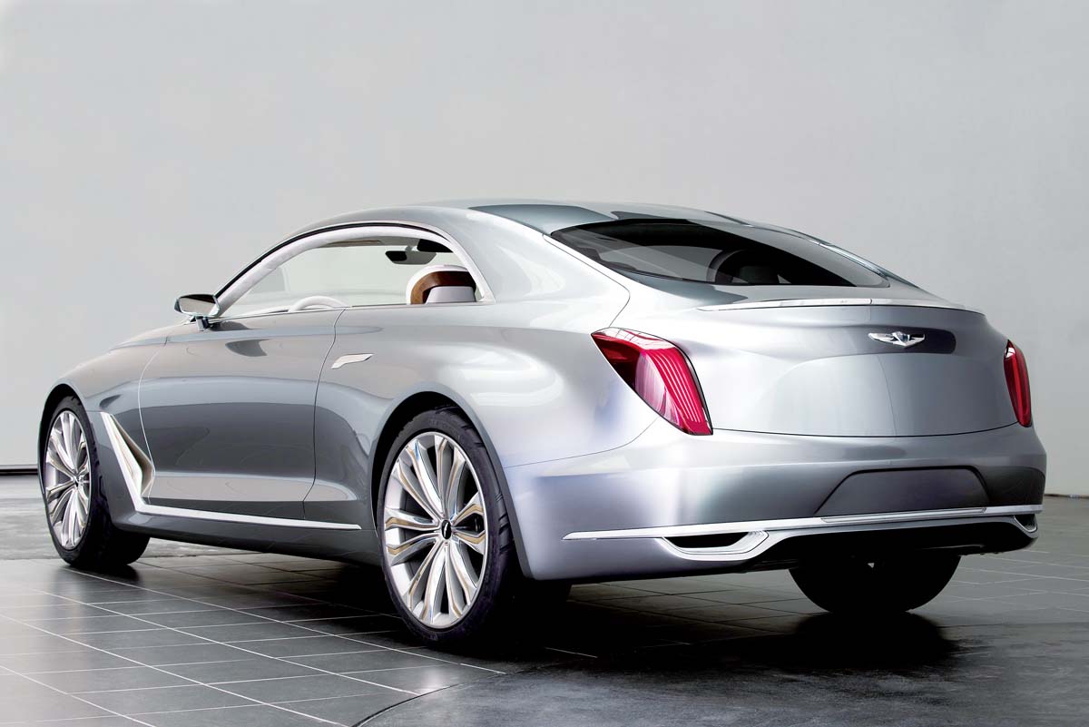 Concept Car總是使用更為大膽的元素進行設計,而Vision G Coupe Concept的設計概念來自全球Hyundai設計工作室,此車的DNA是為了在設計美學與性能之間獲得平衡;說到Vision G Coupe Concept,不禁令人想起Hyundai在2013年底特律車展發表的HCD-14 Genesis Concept,兩部概念車都有著強而有力的肌肉線條,中央仍是大面積的進氣壩,但Vision G Coupe Concept在保桿兩側增加了進氣孔;車側部分儘管已從四門改為雙門設計,但車身腰線極為類似,不過葉子板的散熱孔設計多了幾分運動性,而車尾圓滑的線條加上直立式尾燈,使人深信Vision G Coupe Concept是部線條優美的雙門跑車。
