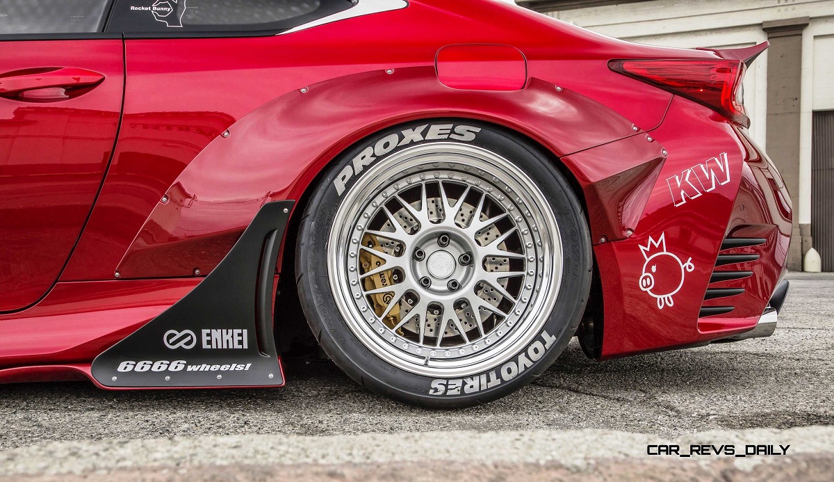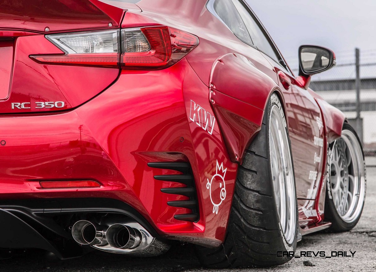 【童國輔/報導】除了RC F外,Lexus針對SEMA Show還推出另外一款以RC350為基礎所打造的改裝車,且改裝幅度比RC F更大。大家是否還記得2013年SEMA改裝車展,一輛Scion FR-S以一套誇張的Rocket Bunny寬體套件引起轟動,而這部RC350 F SPORT也是搭配了同樣誇張的Rocket Bunny寬體套件,來強化視覺效果。相較於原廠的RC350 F SPORT而言,這台寬體怪獸不僅車身高度被大幅降低,為了配合調整後的車輪外傾角,車輪四周的翼板位置也增加了新的寬體套件,使它看上去更加霸氣很多。