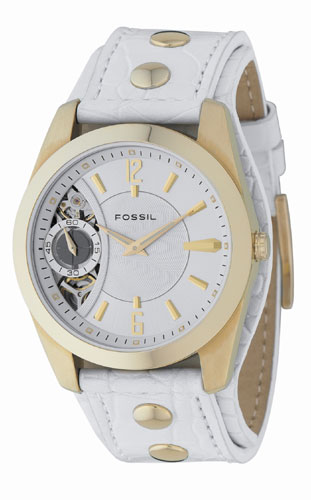 FOSSIL全新TWIST石英機械錶款,以白色為基調呈現夏日純淨的時尚風,搭配金色錶殼、鉚丁和錶面細節,散發出自然率性的氣息,女性錶款更以珍珠母貝與細緻水鑚融入優雅質感;部分裸露的機械機芯,是TWIST系列錶款獨有的設計風格。本系列可搭配成對錶。