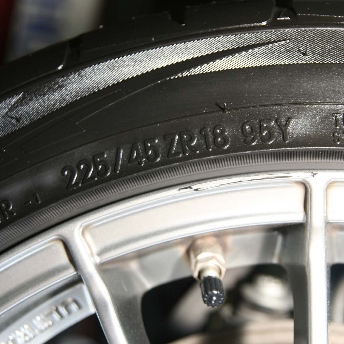| 輪胎上的規格大多為三組數字加上兩個英文字母所組成,例如:225/40ZR18, 「225」為輪胎接地面積的寬度,「40」代表輪胎的「扁平比」,「Z」則表示此輪胎的安全速限等級,「R」則說明此輪胎是輻射層設計,「18」則代表輪胎的內徑,也就是鋁圈的尺寸,單位為英吋。 |