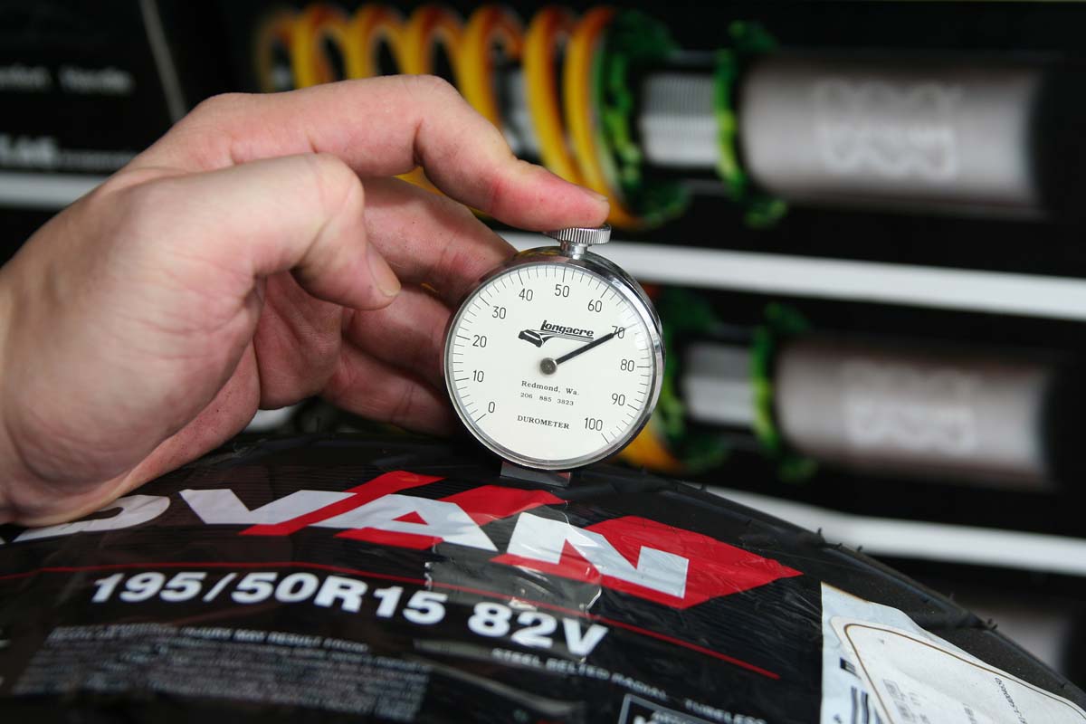 | 透過膠質硬度計的測量,可清楚發現使用2萬公里後的輪胎,膠質硬度明顯較新胎高出許多,這也是為何輪胎會愈用愈吵的原因之一,其他像輪胎變形、胎壓高低等,也會影響輪胎滾動噪音的大小。 |