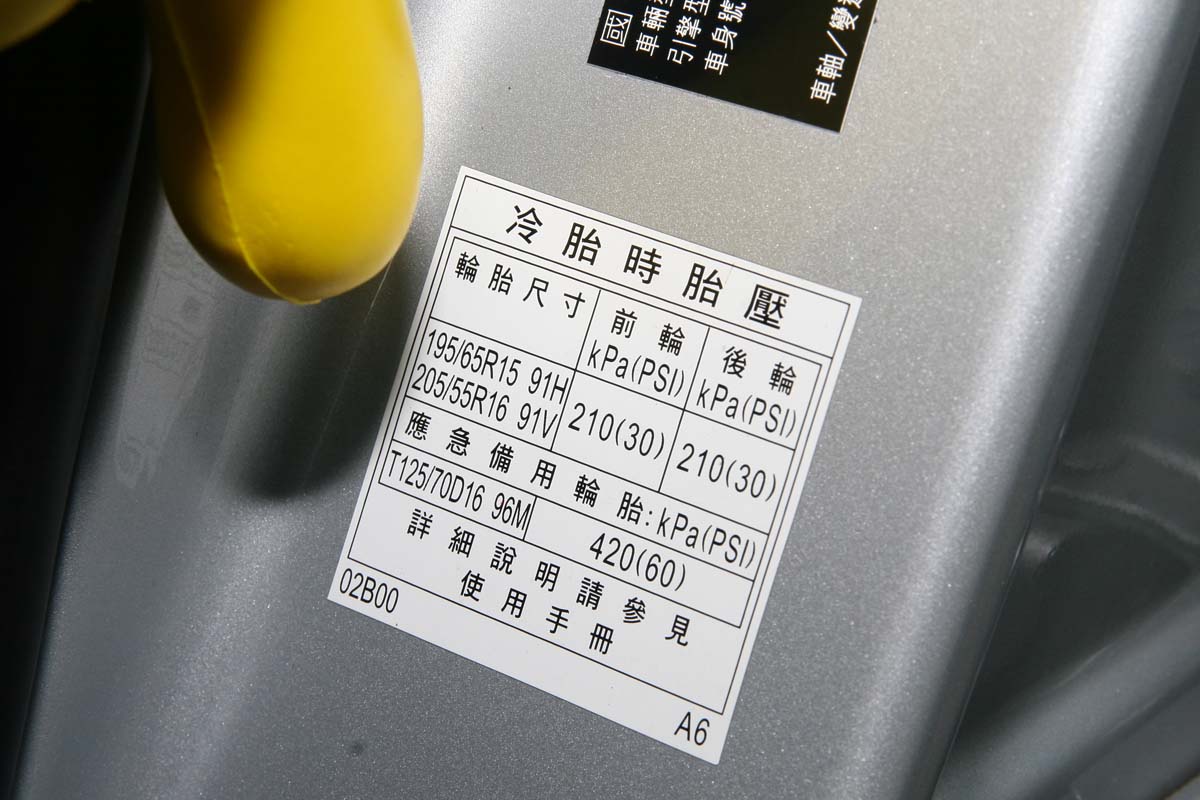 | 胎壓大約控制在28~32psi,不過詳細數值還是需視胎壁硬度、安裝位置、氣候與扁平比等幾個條件來進行調整,此外駕駛座門框上都可找到原廠提供的胎壓建議值,如果輪胎規格沒變可依循此數值來填充輪胎。 |