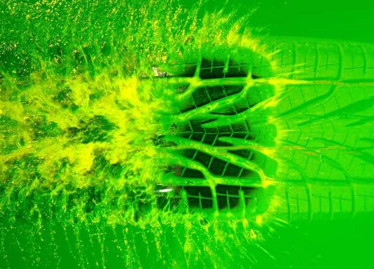 | 輪胎壓過水坑時,輪胎接地面的水,會立即被重量擠壓到排水溝槽內,並隨著輪胎滾動而甩出,因此如果胎紋深度不足,胎面無足夠空間容納雨水的話,輪胎就會漂浮在水面上,並瞬間失去抓地力,形成左右輪搶胎甚至後輪甩尾失控的危險情況。 |
