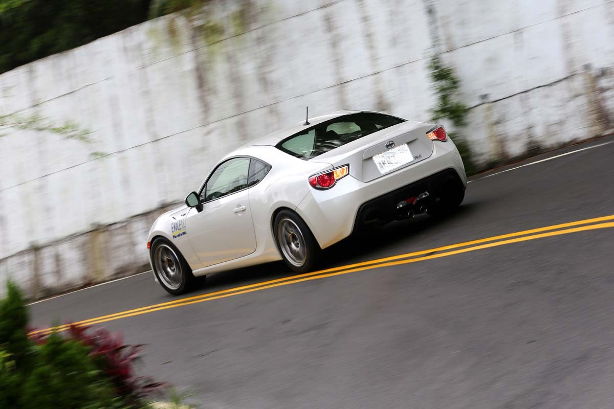 雖然實際的改裝項目並不多,但是配合Bilstein MDS 2Way Damper避震器與Victra VR-1高性能街胎,明確的路感回饋並沒有產生多餘的彈跳感,雖然胎寬略為增加至前後255mm,但是相當輕快的方向盤手感讓車頭轉向非常明確,有助於駕駛輕鬆掌握車輛動態,尤其胎壁所加強的支撐性對於車重僅1200kg的FT-86,即使沒有改裝防傾桿搭配40的胎壁也能有效抑制過彎側傾。