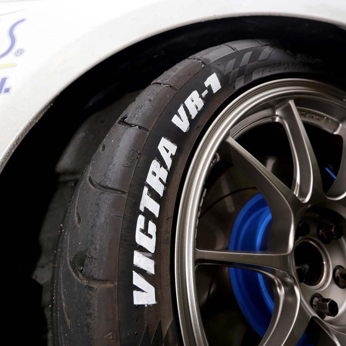 而全新Victra VR-1採用兩條相當深的主溝槽胎紋設計,配合左右兩側不對稱的排水紋,藉此有助於輪胎在溼地時能夠快速排水,進而降低發生水漂現象,同時內外兩側大面積的胎塊更能夠確保輪胎隨時提供抓地力,雖然Victra VR-1目前仍未正式發表上市,但是據廠方私下透漏大鵬灣賽道所測試成績為2分02秒(原廠手排FT-86),優異的高性能表現勢必對於同級競爭產品造成嚴重衝擊。雖然說正式推出時程預計在2016年,但是2015年OTGP的Civic Cup組別也以此胎作為指定雨胎,藉此確保車輛在雨天時能有最佳排水性與抓地力。