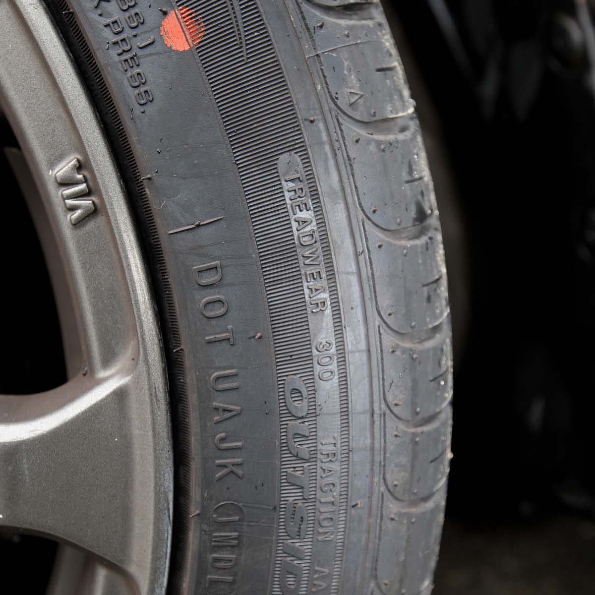 這款由韓製Roadstone SU1輪胎設定的磨耗指數為300,從胎紋設計來看,主要是由中央三條胎塊與四條排水槽所組成,胎塊內的胎紋寬度不算大,可提供比較好的摩擦力與滾動靜肅性,雖然胎紋非單導向設計,不過胎壁上還是有內外側的安裝方式標示,看來調胎時還要注意一下位置。至於胎肩與胎壁設計,其上有著寬度與深度都不小的胎紋,搭配大小適中的胎塊,可以提供輪胎不錯的排水性能,並且有效保護輪圈的邊緣,在停車不小心碰到人行道時,還可保護輪圈不受損。
