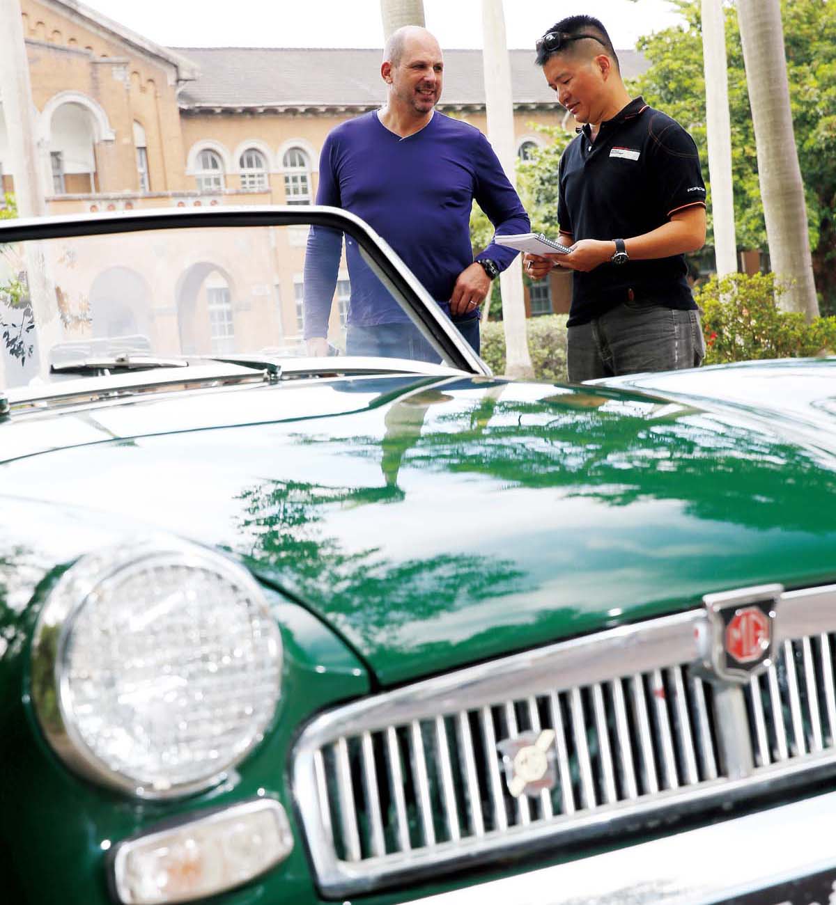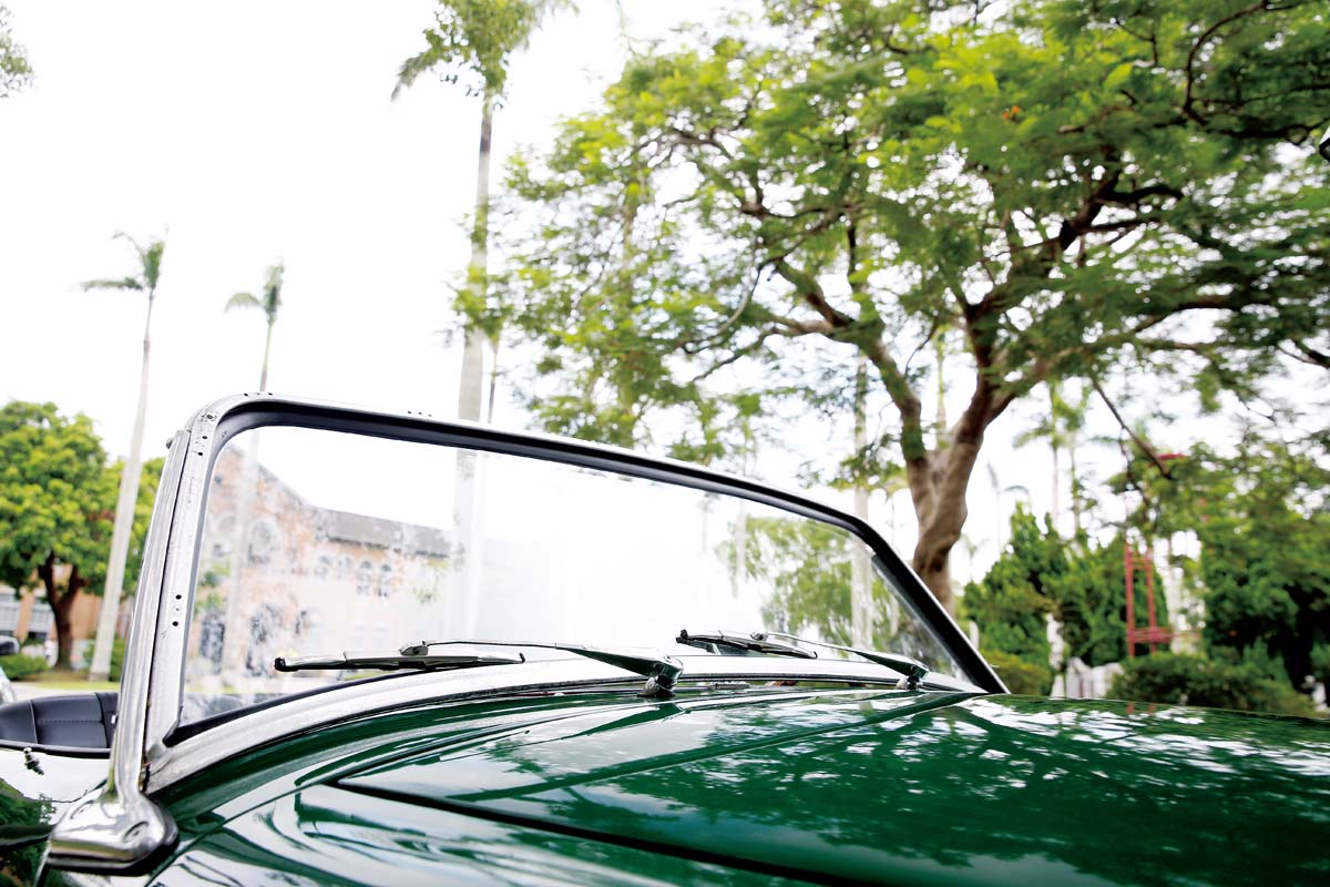 採訪當天,Mark早已來到現場等著我們,我們不需要特地尋找,1963年的老車會自動吸引人們的視線。儘管又低又小,Midget仍然發揮鶴立雞群的作用,雅緻的車體,圓弧的鈑件,有稜有角的收邊,再搭配最具象徵性的英國綠塗裝,在一片追求空氣力學、安全工程的現代汽車時潮中,Midget的美感顯得出類拔萃。仔細端詳,鍍鉻金屬保險桿、直瀑式進氣罩、四爪框、胖胖胎……這些60年代元素聚集在於一起,綻放出耀眼的光芒。