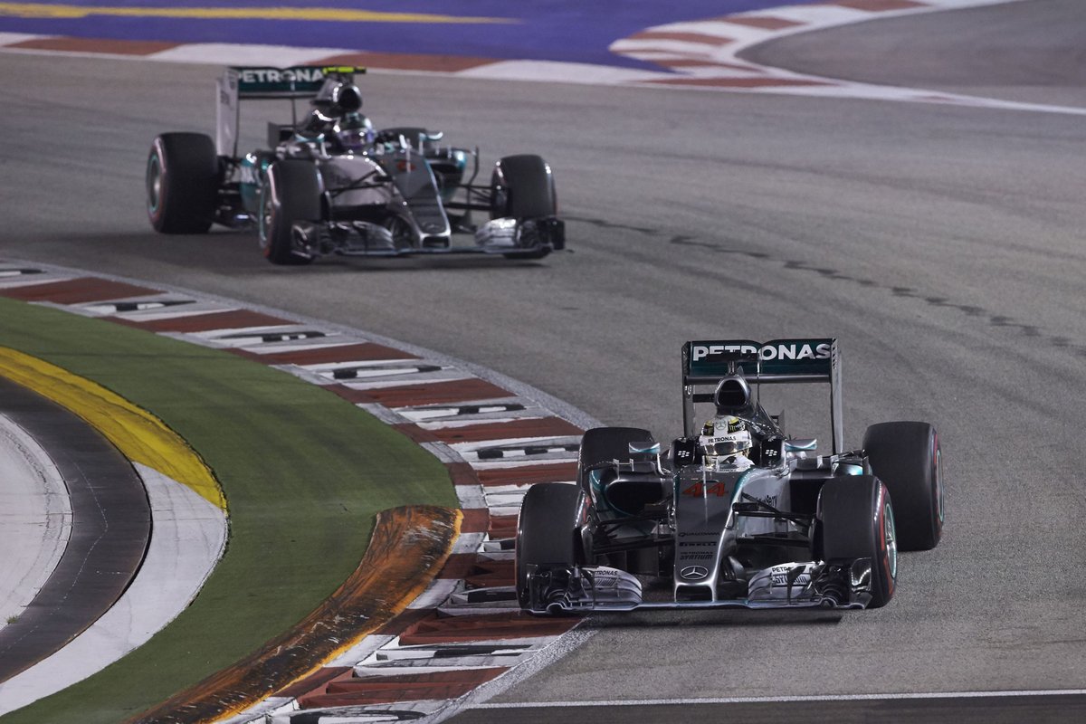 由於車輛調校因素,Mercedes-AMG W06 Hybrid賽車在新加坡站突然失去過往堪稱無敵的競爭力,從排位賽開始便被Ferrari車隊壓著打,甚至到了正賽Lewis Hamilton還因賽車失去動力意外退賽,最終Nico Rosberg也僅以第四名收場,跌破了許多專家眼鏡,本站也是兩位車手今年首度沒有登上頒獎台的一次。而接下來的日本、俄羅斯、美國、墨西哥四站就沒有太大意外,冠軍車手皆由MERCEDES AMG PETRONAS所包辦,Lewis Hamilton拿下了三次,Nico Rosberg拿下一次,因此車隊也順利在俄羅斯站拿下年度車隊冠軍,Lewis Hamilton則是在美國站拿下年度冠軍車手頭銜。