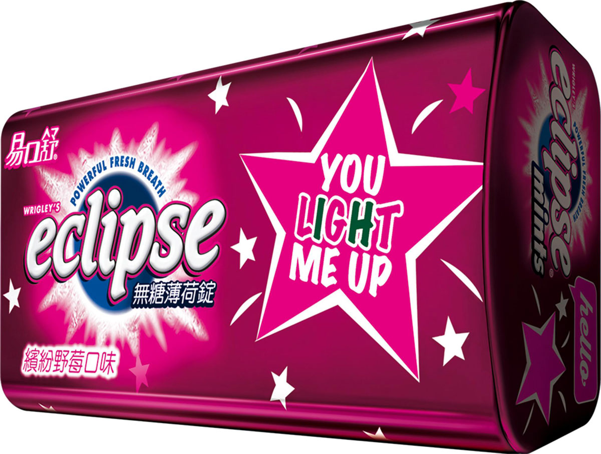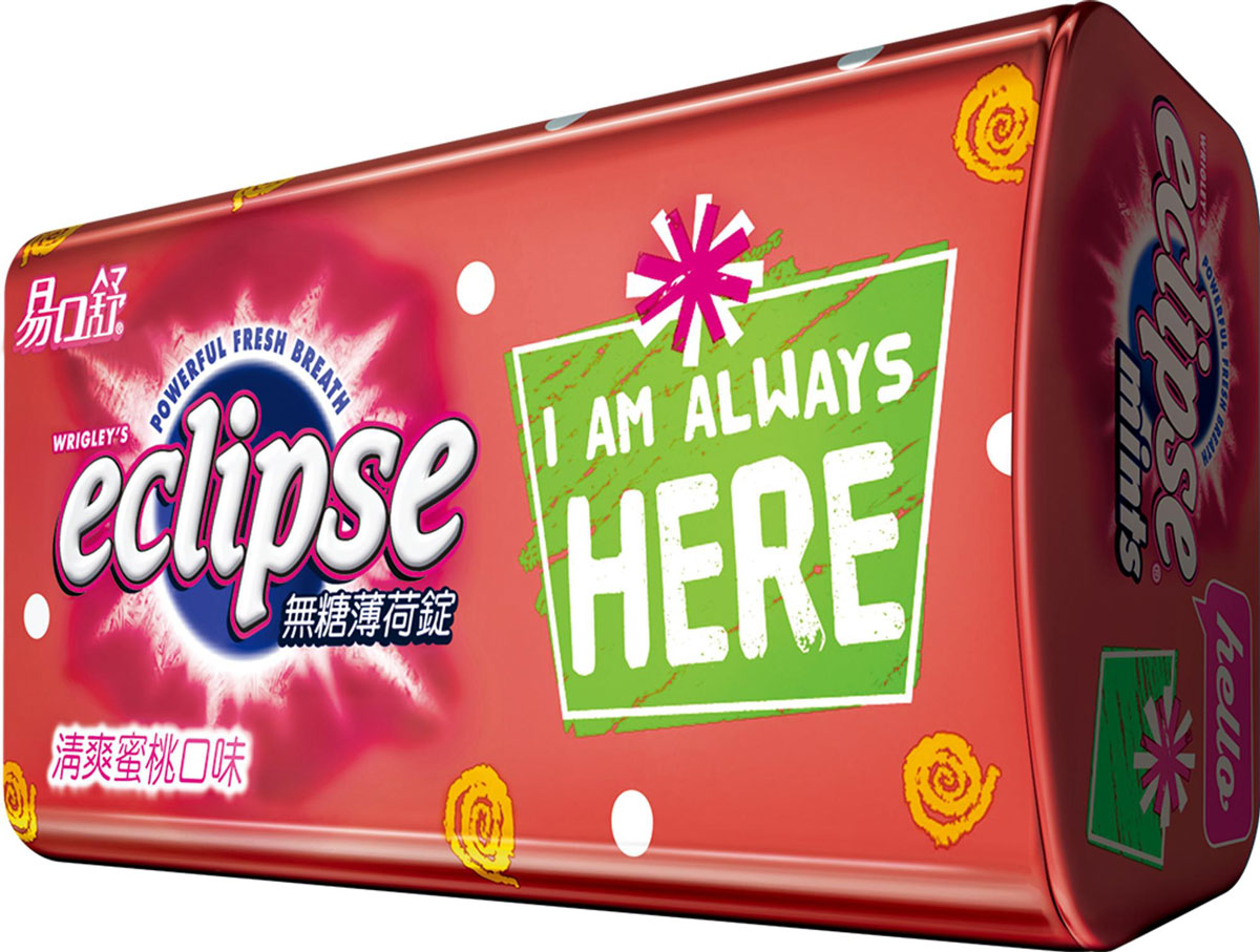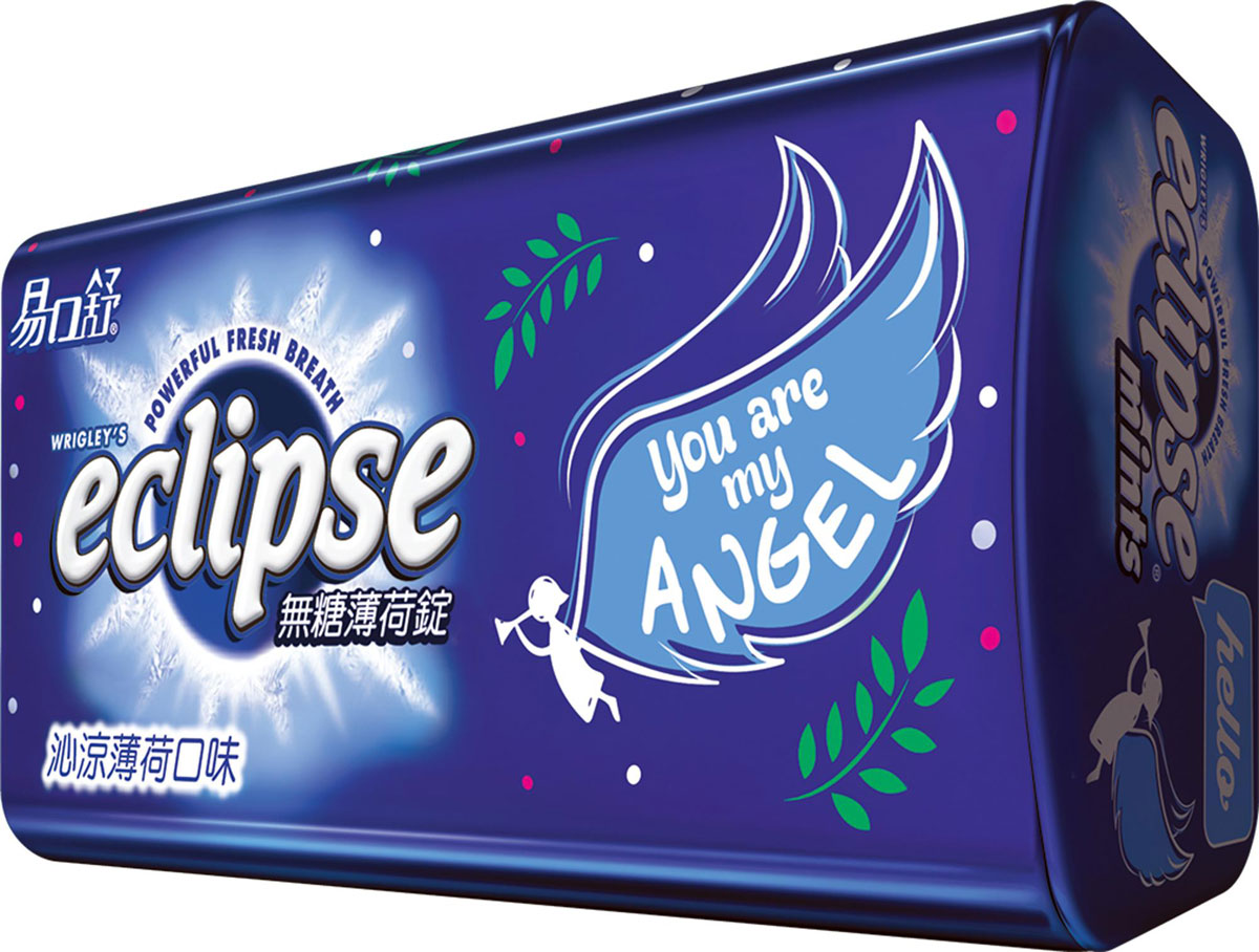 今年聖誕節Eclipse®易口舒無糖薄荷錠依然帶來與眾不同的新感受。推出聖誕季節獨特的 ”To - From” 屬名設計,以小小巧思傳遞溫馨快樂的訊息和品牌的完美結合。今年聖誕節限定版是由四種口味的季節罐:深藍色的"勁爽薄荷"-「You are my angel」(你是我的天使)、淡藍色的"沁涼薄荷"-『Love is everywhere』(愛無處不在)、"繽紛野莓"「You light me up」(你使我發光)、-「I am always here」(我永遠挺你),瓶身的底部及圖繪裝飾物即可寫上”To - From” 讓消費者可以把不同的內心祝福,送給心裏特別的人,每種口味都有著相應的祝福話語,讓走在潮流上的消費者展現無比的品味,也能在聖誕節傳達愛和祝福給重要的人。