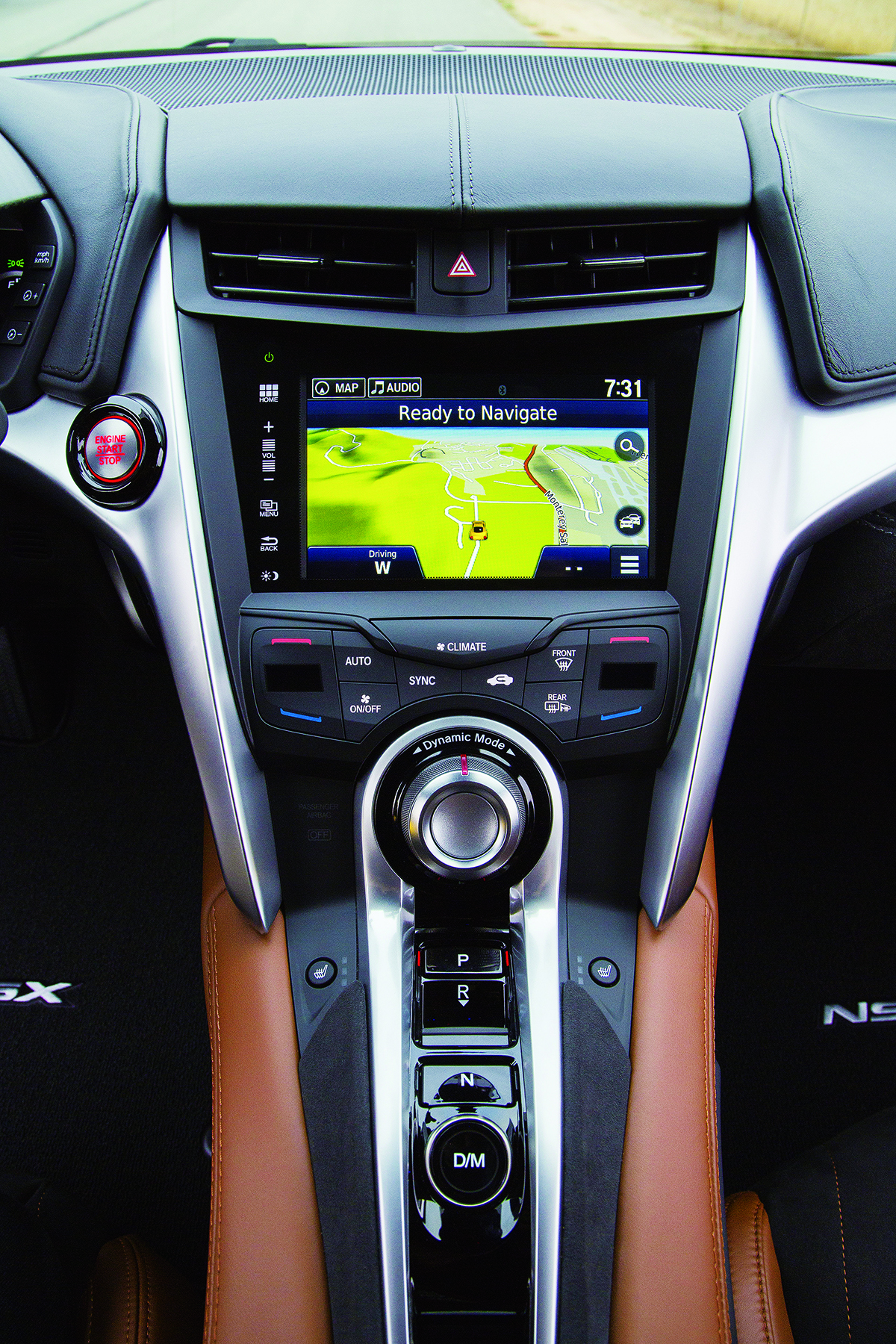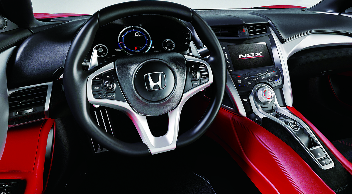 中控檯延續初代NSX的傾斜並延伸至鞍部的設計,上方8吋TFT觸控螢幕彙整多功能影音及導航顯示總成,至於最常使用的空調系統,則採最直接方便的按鍵介面。再往下,就是全新NSX相對初代NSX最大的差異了,檔位選擇都採用電子操控介面,P檔按鍵上方式為IDS(Integrated Dynamics System)整合行車動態系統旋鈕,透過左右旋轉,可切換Quiet、Sport、Sport+及Track四種行車動態模式,隨著不同模式的選擇,包括動力輸出、換檔時機、煞車反應、電子轉向輔助、SH-AWD系統、懸吊阻尼設定、引擎聲浪……等所有行車動態相關系統都會因應調整,讓NSX隨駕駛者需求來做出最適當的性能對應。